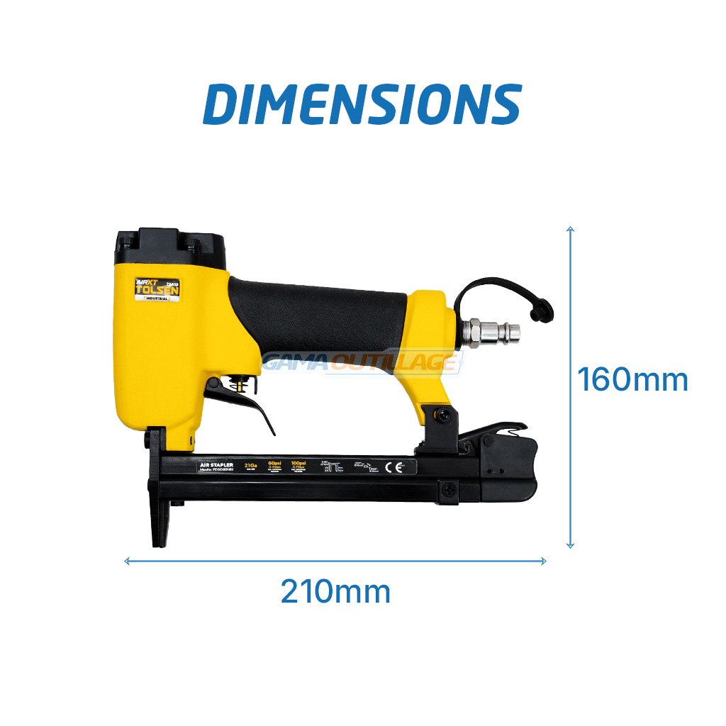 L’agrafeuse pneumatique Tolsen 73425 est un outil industriel performant conçu pour les agrafes de 21Ga (6-16mm). Elle dispose d’une gâchette de sécurité, d’un chargeur de 120 pièces et d’un kit d’accessoires complet.