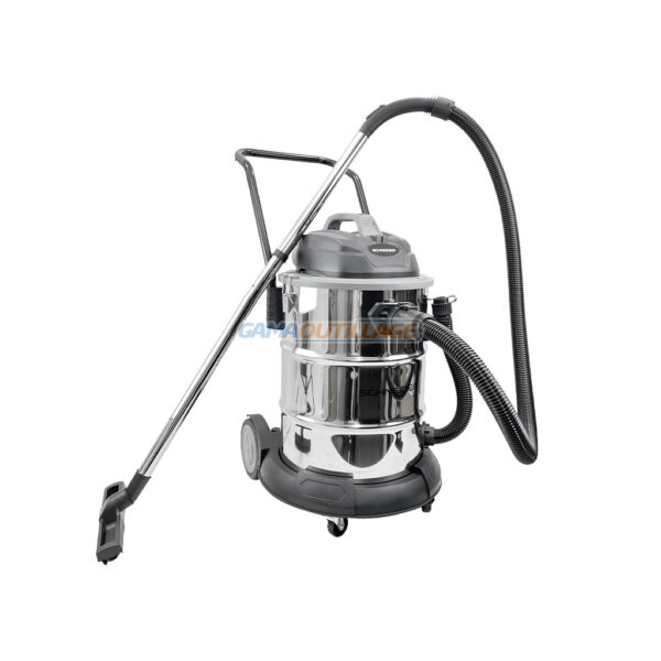 Aspirateur SCHNEIDER 1600W 50L. Filtre HEPA, soufflerie, cuve inox, accessoires inclus. Pour usage professionnel ou atelier. Disponible chez GAMA OUTILLAGE.
