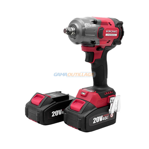 Boulonneuse à chocs sans fil WORCRAFT XCUBE006 20V, couple 850Nm, carré 1/2″, moteur brushless. Livrée avec 2 batteries 4.0Ah et chargeur en mallette.