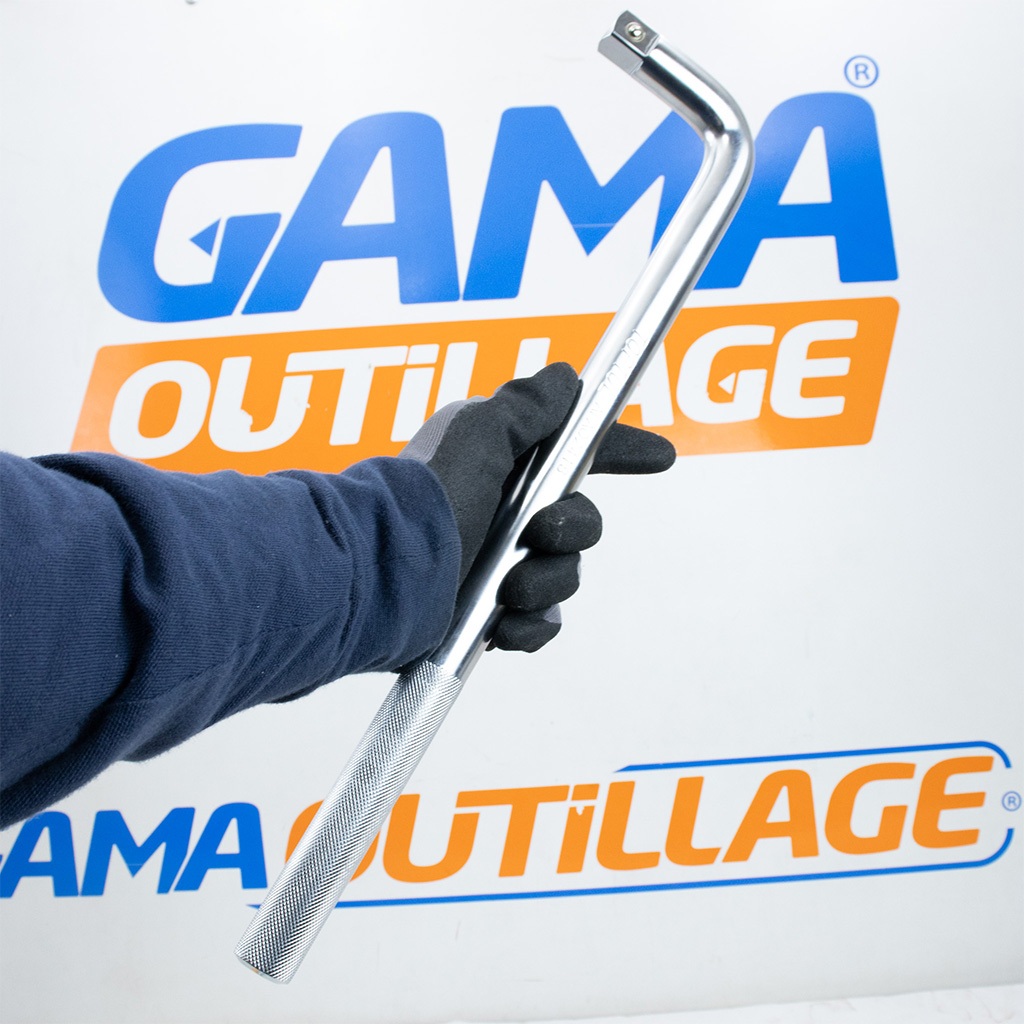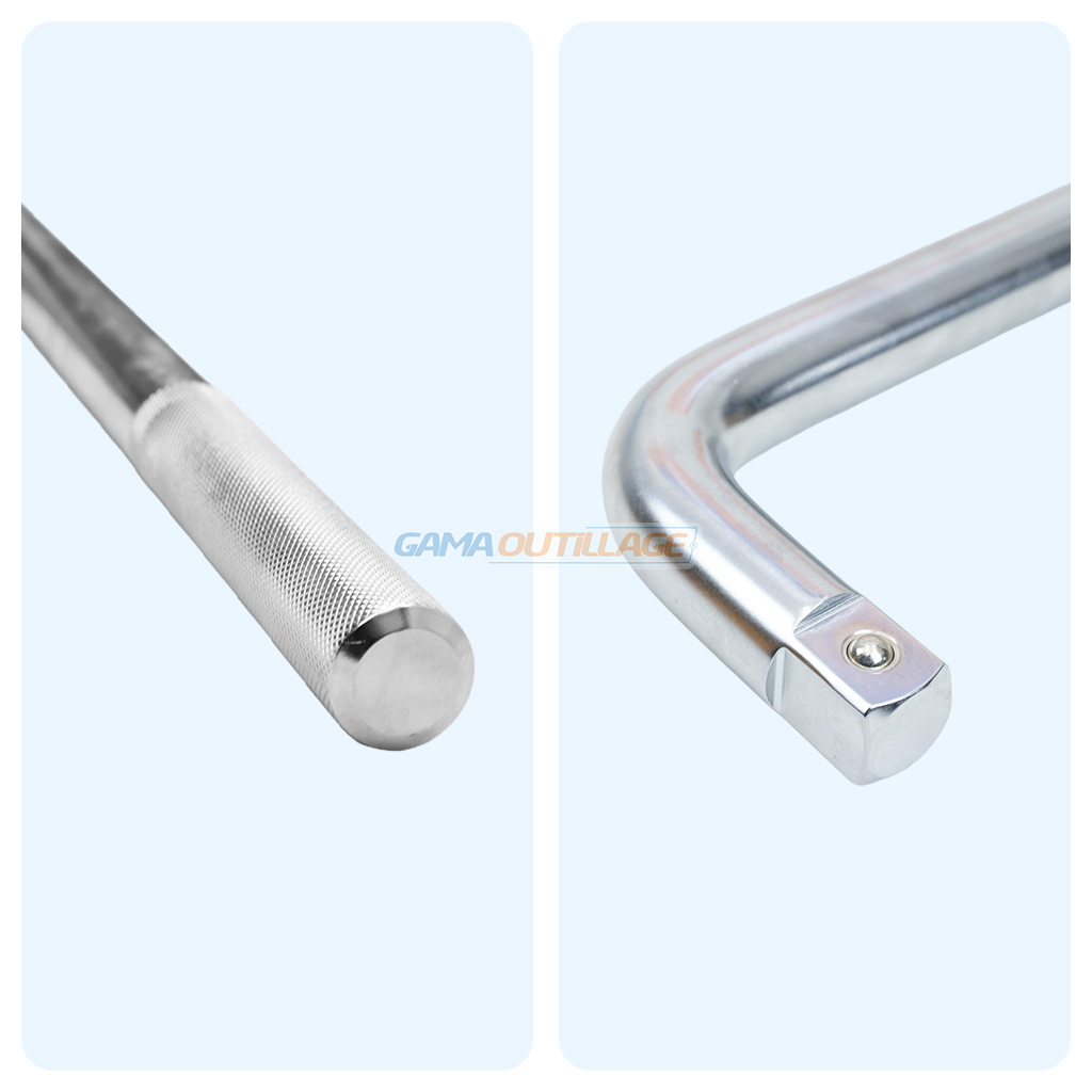 Sa forme coudée permet un accès facilité aux écrous difficiles, tandis que sa longueur de 450 mm assure une excellente démultiplication de la force.