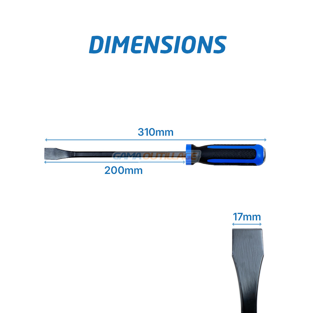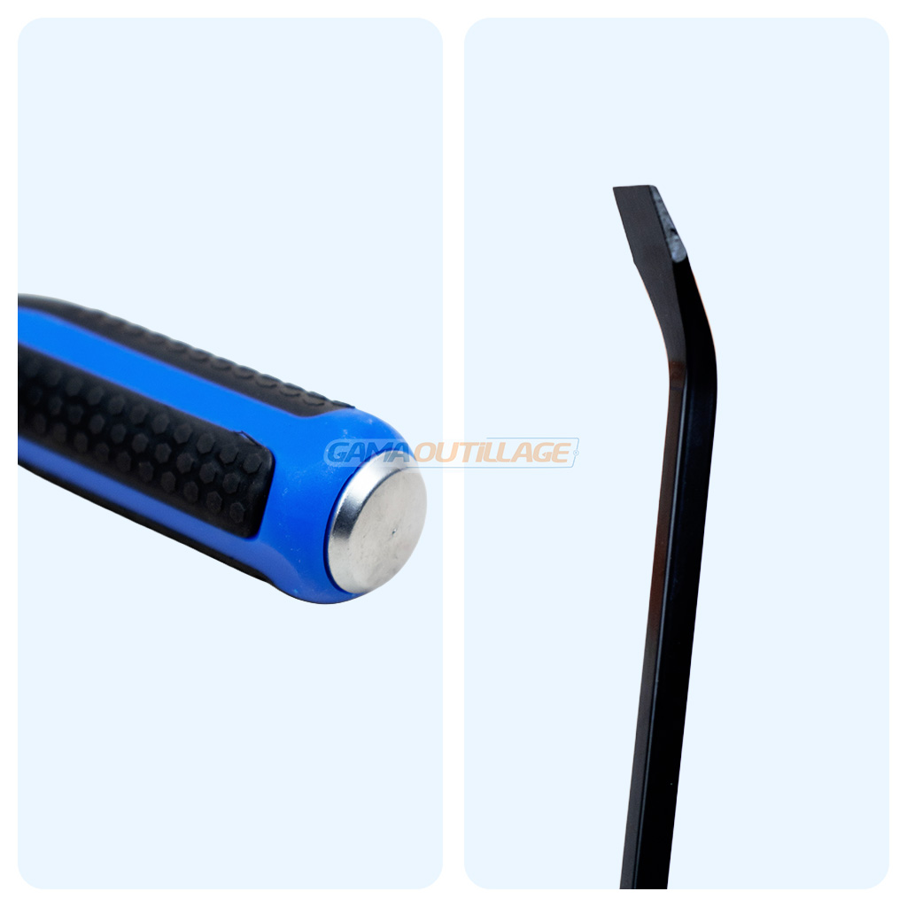 Doté d’une longueur totale de 310 mm, dont 200 mm de tige utile, ce levier offre un excellent effet de bras de force. Sa poignée ergonomique bi-matière noire et bleue assure une prise en main confortable et sécurisée, même lors d’un usage prolongé en atelier.