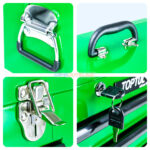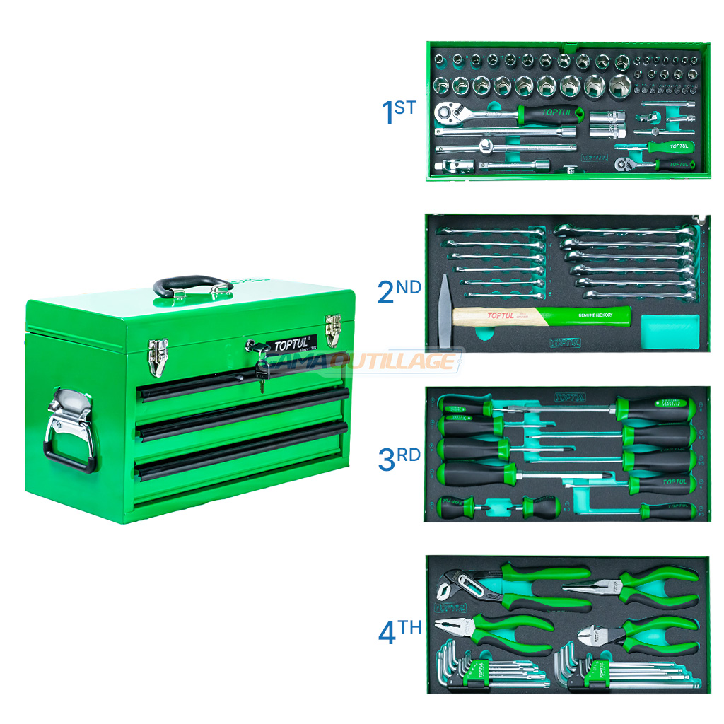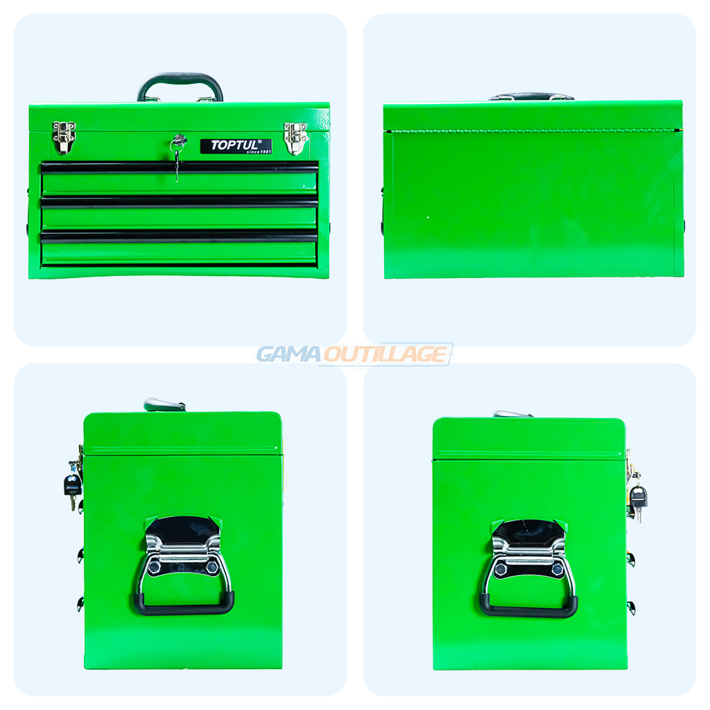 La caisse à outils 99 pièces TOPTUL GCAZ0038 est un coffret professionnel complet conçu pour les mécaniciens, artisans et bricoleurs exigeants. Elle se présente sous forme d’une caisse métallique robuste à 3 tiroirs, équipée d’une poignée de transport supérieure et de poignées latérales renforcées.