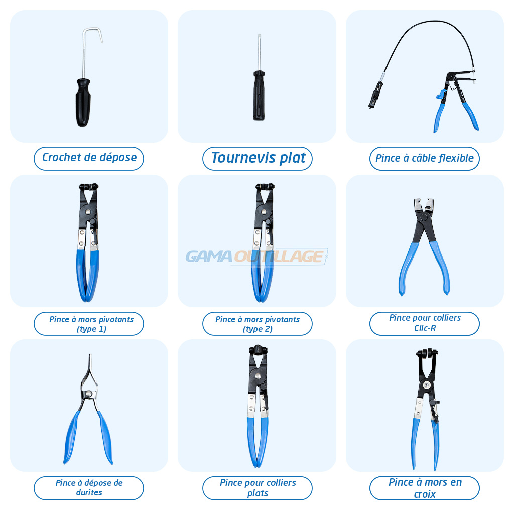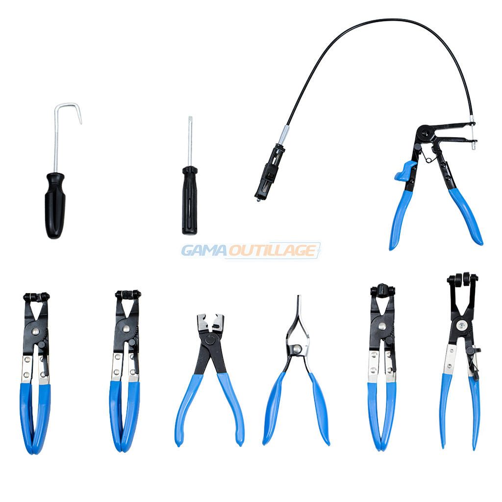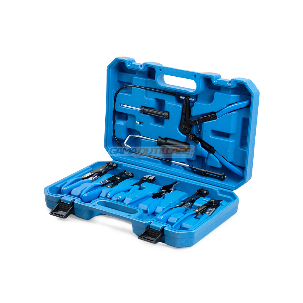 | Contenu du kit | Pince à câble flexible, pinces à mors pivotants, pince Clic-R, pince à durites, crochet de dépose, tournevis plat |
