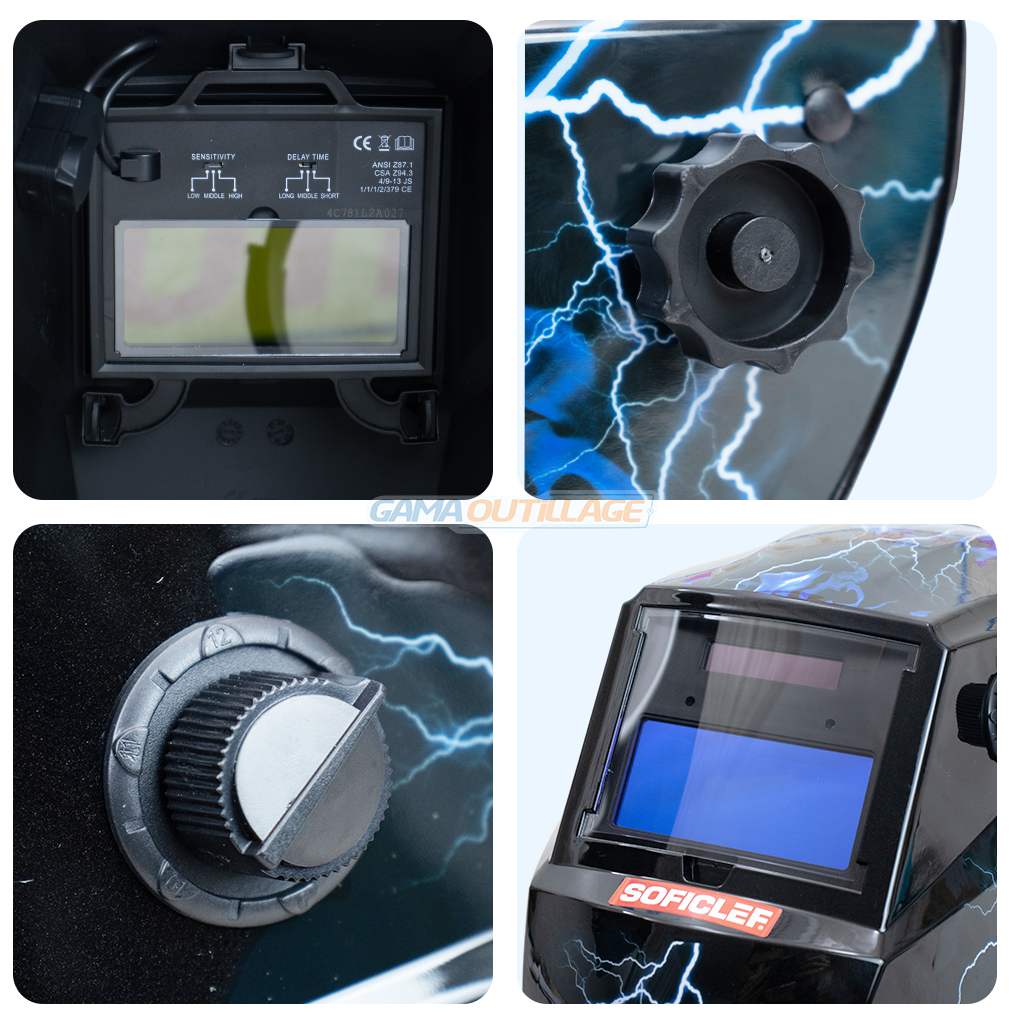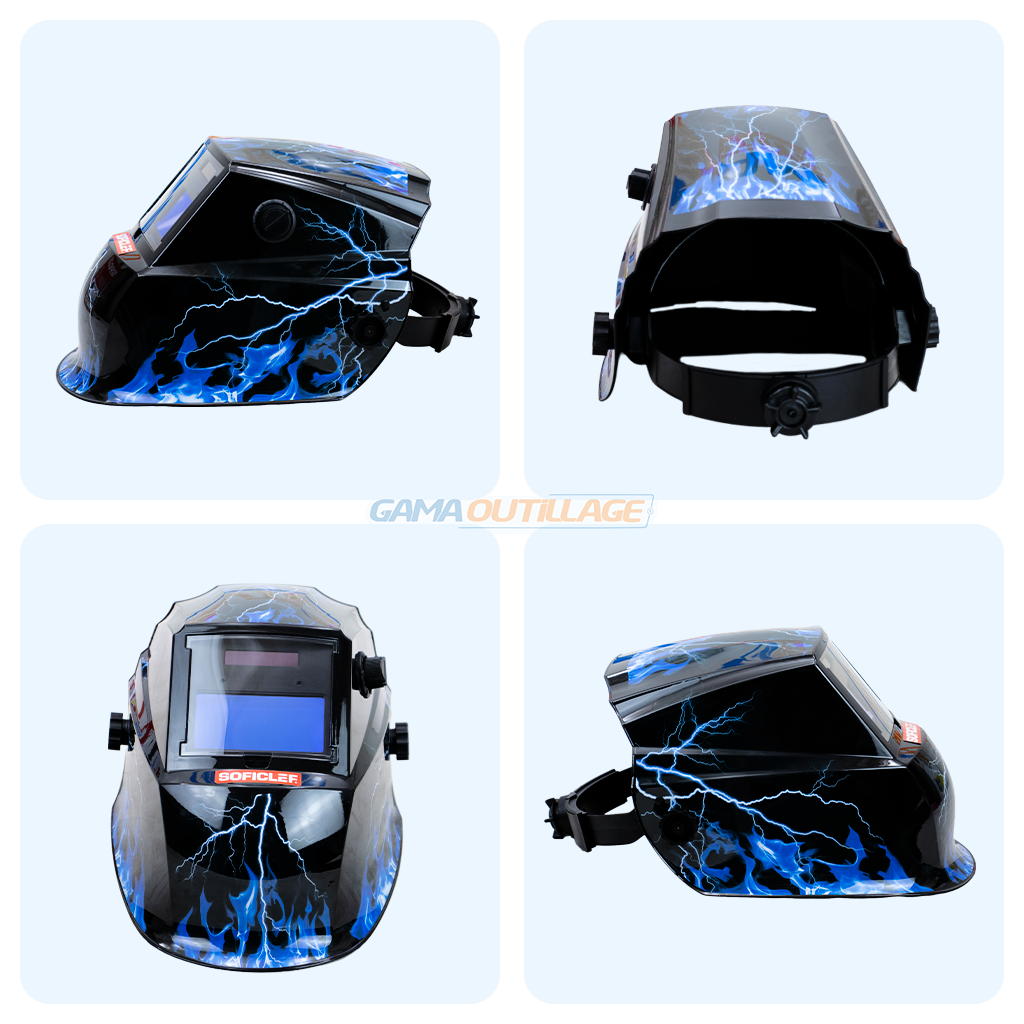 Le Casque de soudage automatique Soficlef référence CAS-1190B est un équipement de protection oculaire de haute performance conçu pour assurer une sécurité optimale lors des travaux de soudure. Grâce à sa technologie de filtre auto-obscurcissant, ce dispositif réagit instantanément à l’arc électrique pour protéger l’utilisateur contre les rayonnements nocifs. Son design ergonomique, orné de motifs d’éclairs bleus, allie esthétique et fonctionnalité, offrant une protection faciale complète tout en restant léger et confortable pour de longues sessions de travail. Il est parfaitement adapté aux procédés de soudage courants tels que le SMAW, le MIG et le TIG.