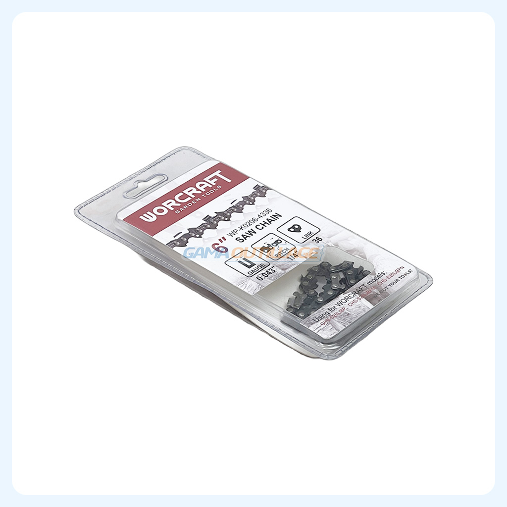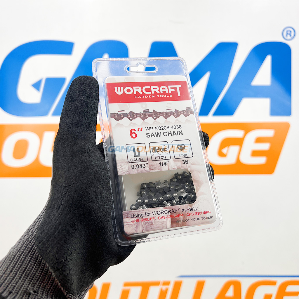 Chaîne de rechange WORCRAFT 6″ pour mini scie CHS. Pas 1/4″, jauge 1,1 mm, 36 maillons. Coupe bois rapide et précise.