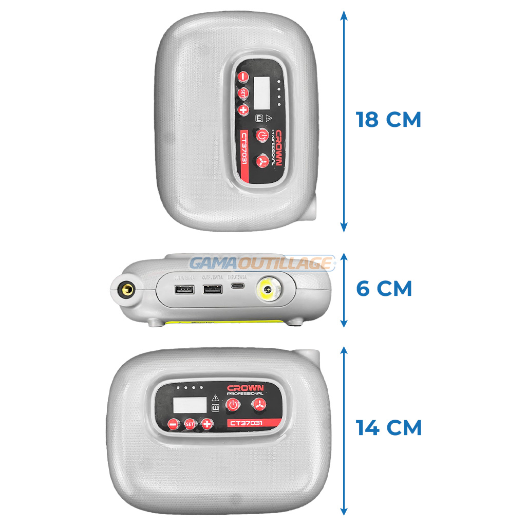 Chargeur et gonfleur CROWN CT37031 12V 100W, batterie 10000mAh, démarrage d’urgence (140A), sortie USB et entrée TYPE-C. Dimensions : 18x14x6 cm.