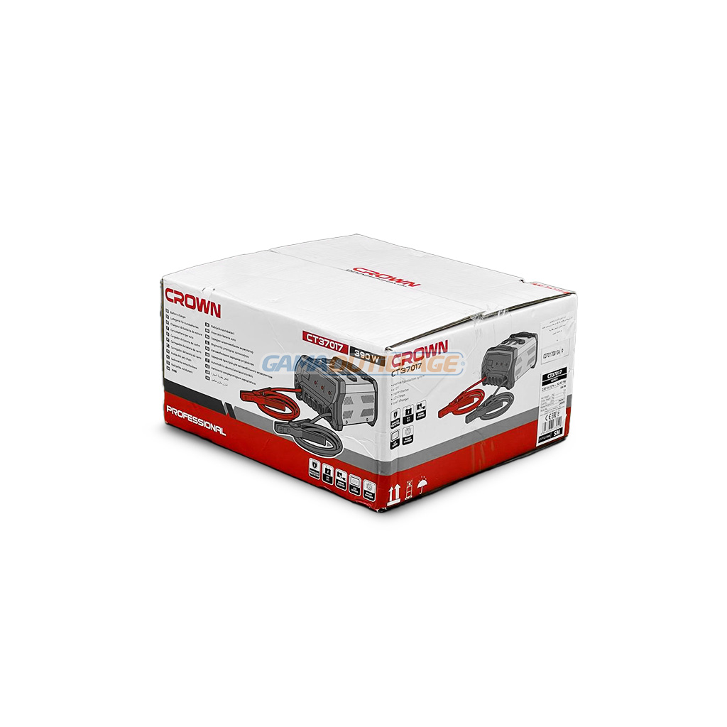 Chargeur CROWN CT37019 1200W, compatible 12V/24V (20-600Ah), câbles 200 cm. Dimensions : 31 × 31 × 17 cm.