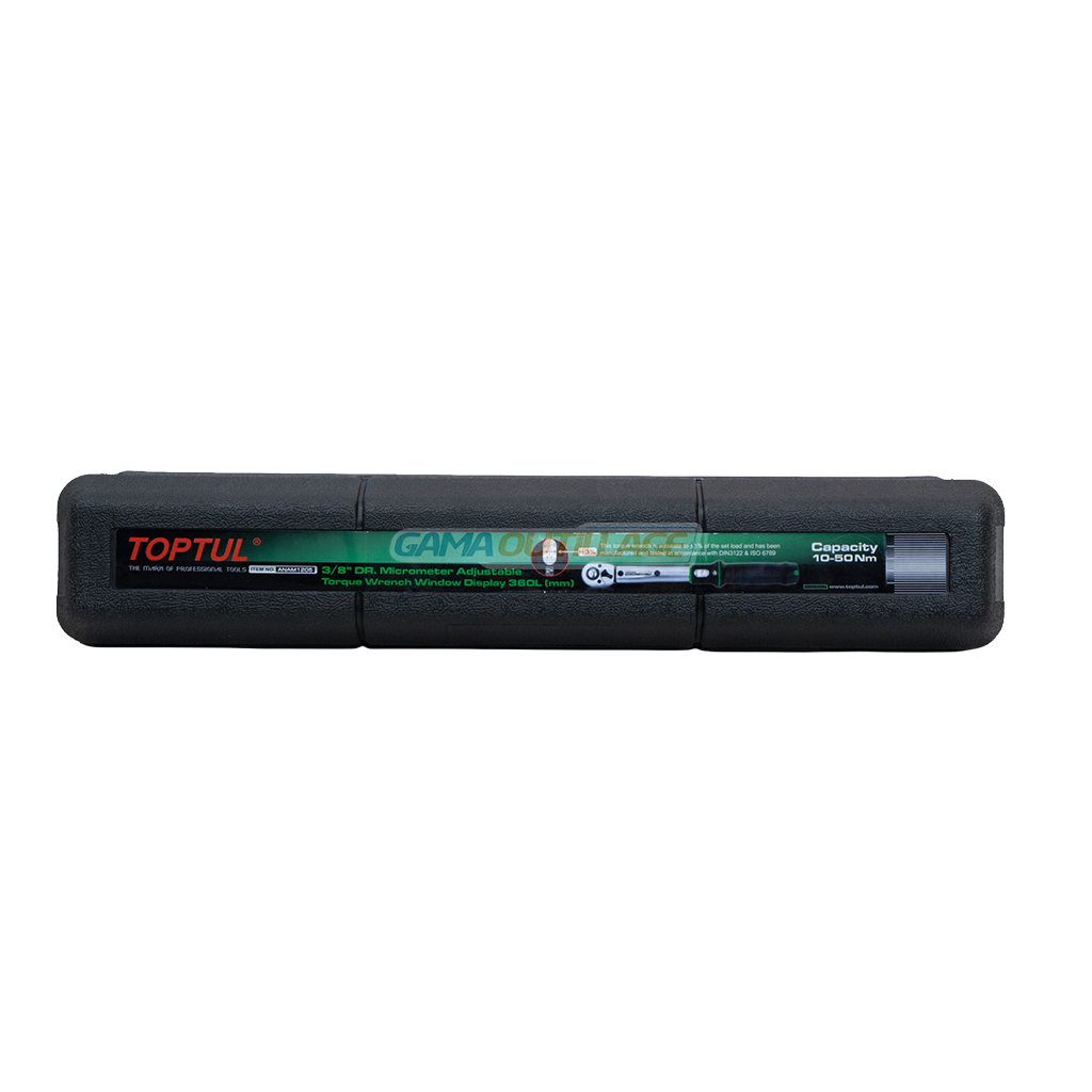 Clé dynamométrique 3/8″ TOPTUL 10–50Nm avec affichage fenêtre, précision ±3 % et déclenchement sonore pour un serrage contrôlé.