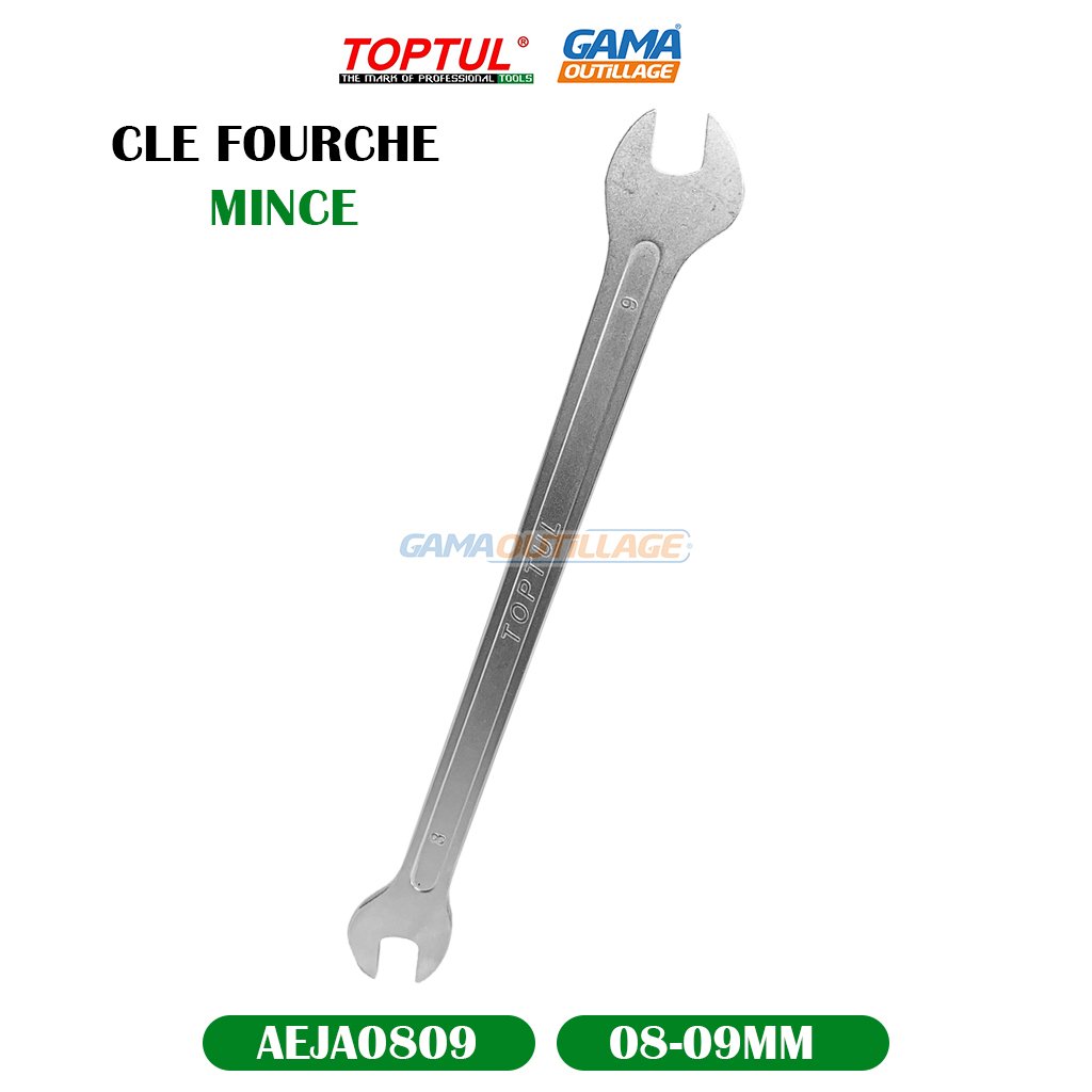 CLE FOURCHE MINCE 08-09 TOPTUL, est un outil spécialement conçu pour accéder et serrer/desserrer des écrous et des boulons dans des endroits difficiles d’accès, où une clé standard ne passerait pas.