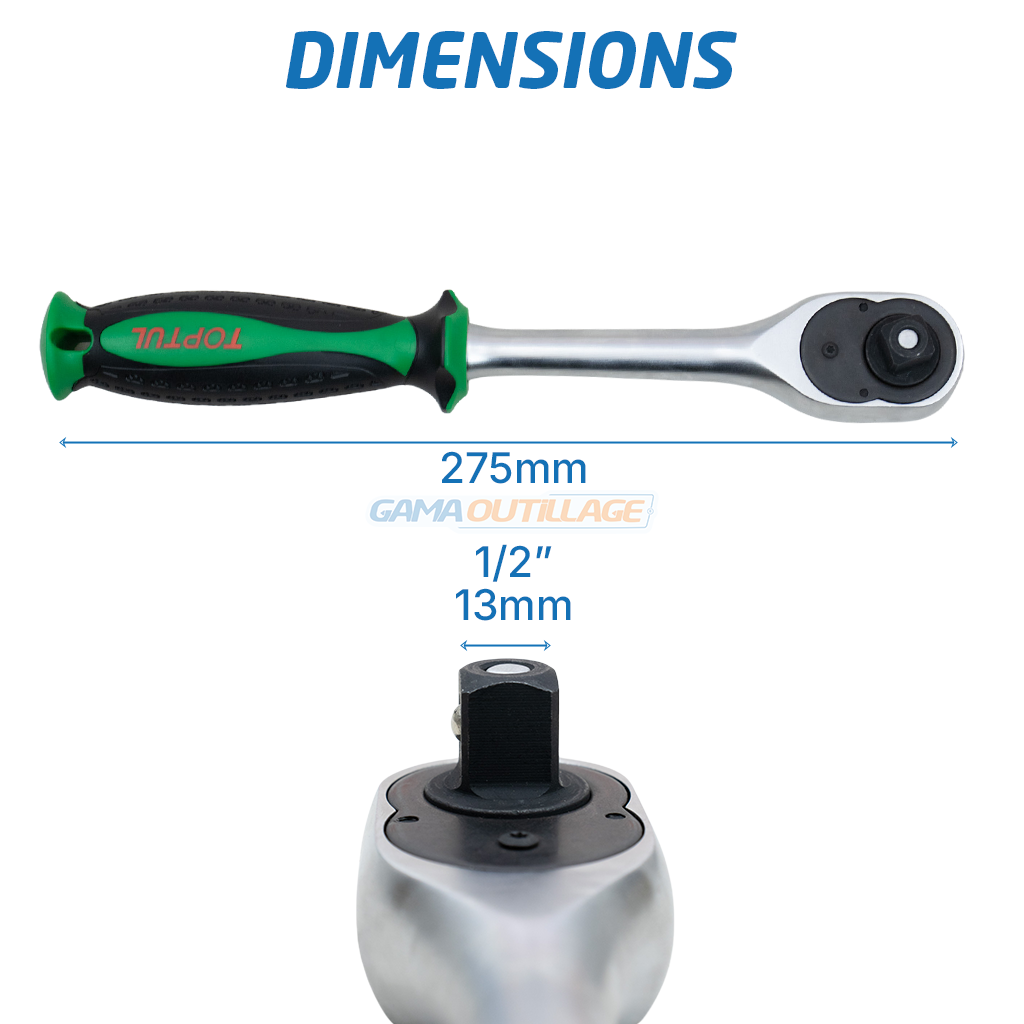 (1 avis client)Cliquet 1/2 TOPTUL robuste avec poignée ergonomique, mécanisme réversible et bouton d’éjection rapide pour un travail précis et confortable.