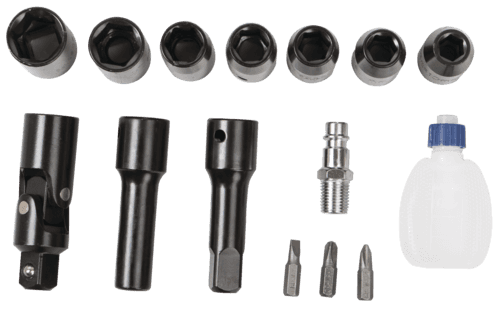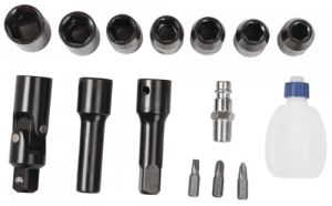 - 7 x douilles, carré 1/2 pouce, 1 extension carré 1/2 pouce, 1 renvoi d’angle à cardan carré 1/2 pouce, 3 embouts et 1 porte embouts et 1 burette d’huile