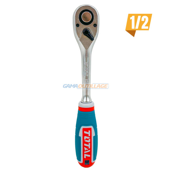 GAMAOUTILLAGE vous propose une CLIQUET REVERSIBLE 1/2″ TOTAL, Poignée à cliquet réversible avec dégagement rapide, Le cliquet 1/2″ Poignée Plastique Total est un outil de qualité professionnelle qui est parfait pour les travaux de bricolage et de réparation. Il est fabriqué en acier Chrome vanadium, ce qui lui confère une grande robustesse. Le cliquet est également équipé d’un mécanisme de cliquet qui permet de serrer et de desserrer rapidement les vis.
