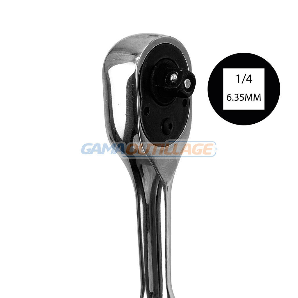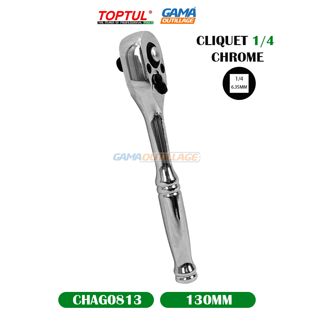CLIQUET 1/4 CHROME TOPTUL, est un outil manuel à main utilisé pour serrer ou desserrer des vis et des écrous à tête hexagonale. Le terme “1/4” fait référence à la taille de l’embout qui se fixe sur le cliquet, mesurée en pouces.