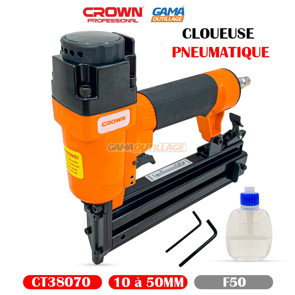 - La cloueuse de finition pneumatique 50mm 18Ga de la marque CROWN est un outil conçu pour fixer des clous de finition de calibre 18Ga avec une longueur de 50mm.