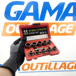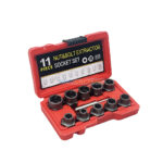 Coffret extracteur de boulons 11 pièces en acier CR-MO. Douilles 8-19 mm avec profil spécial pour vis et écrous abîmés.