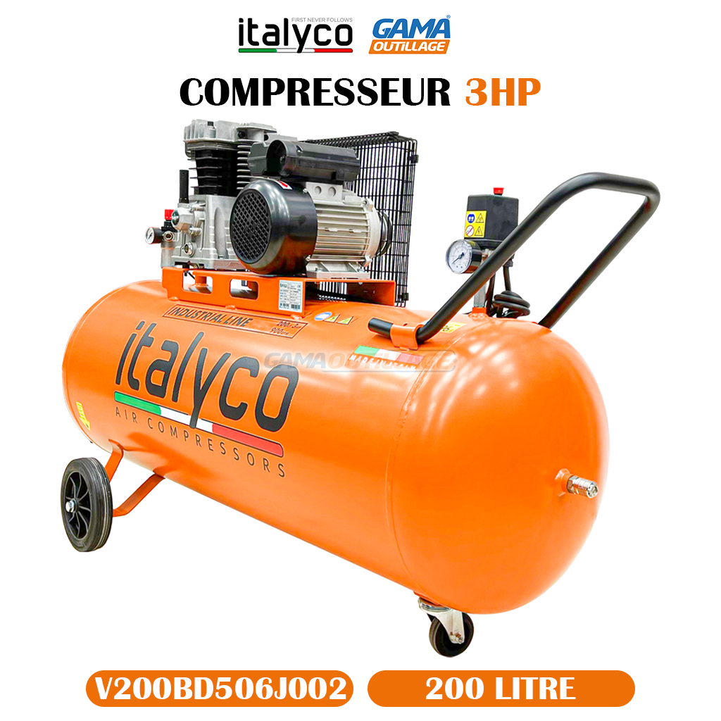 GAMAOUTILLAGE vous propose une COMPRESSEUR 200LT 3HP ITALYCO, est un compresseur d’air professionnel ITALYCO KP 200/3 , système « bas régime » avec seulement 900 tr/min réduit le bruit et prolonge la durée de vie de l’élément de pompage. Produit entièrement en ITALIE.