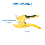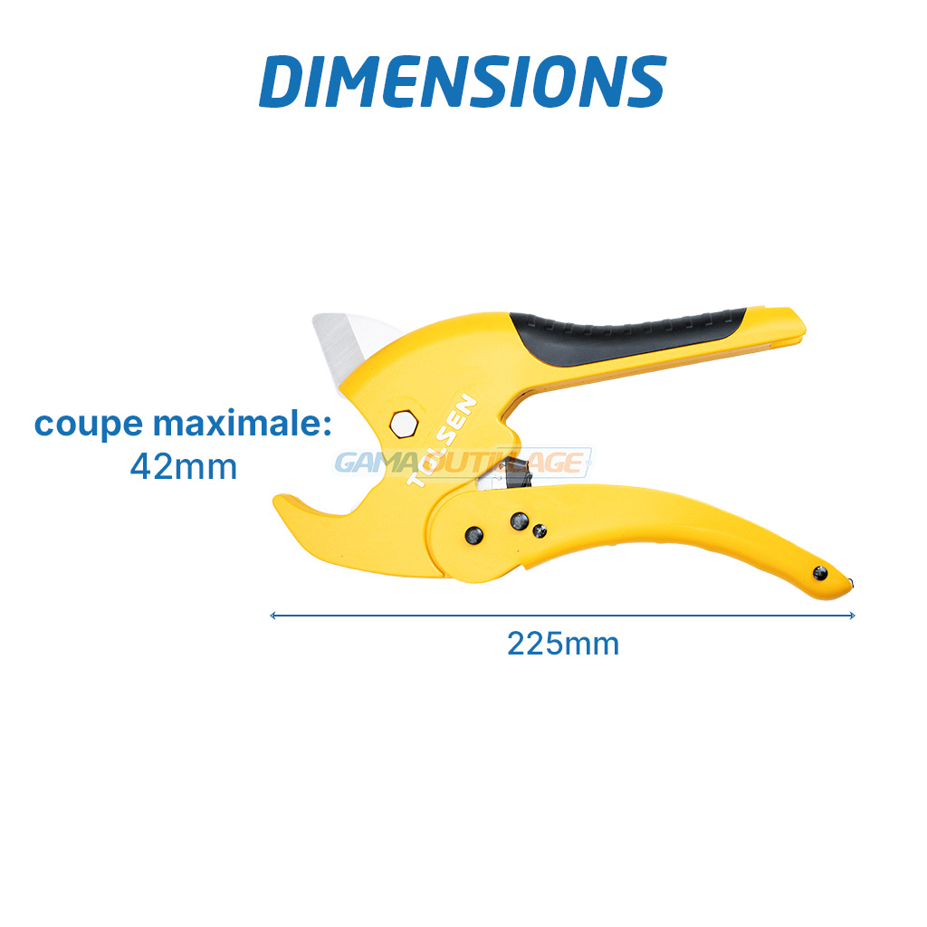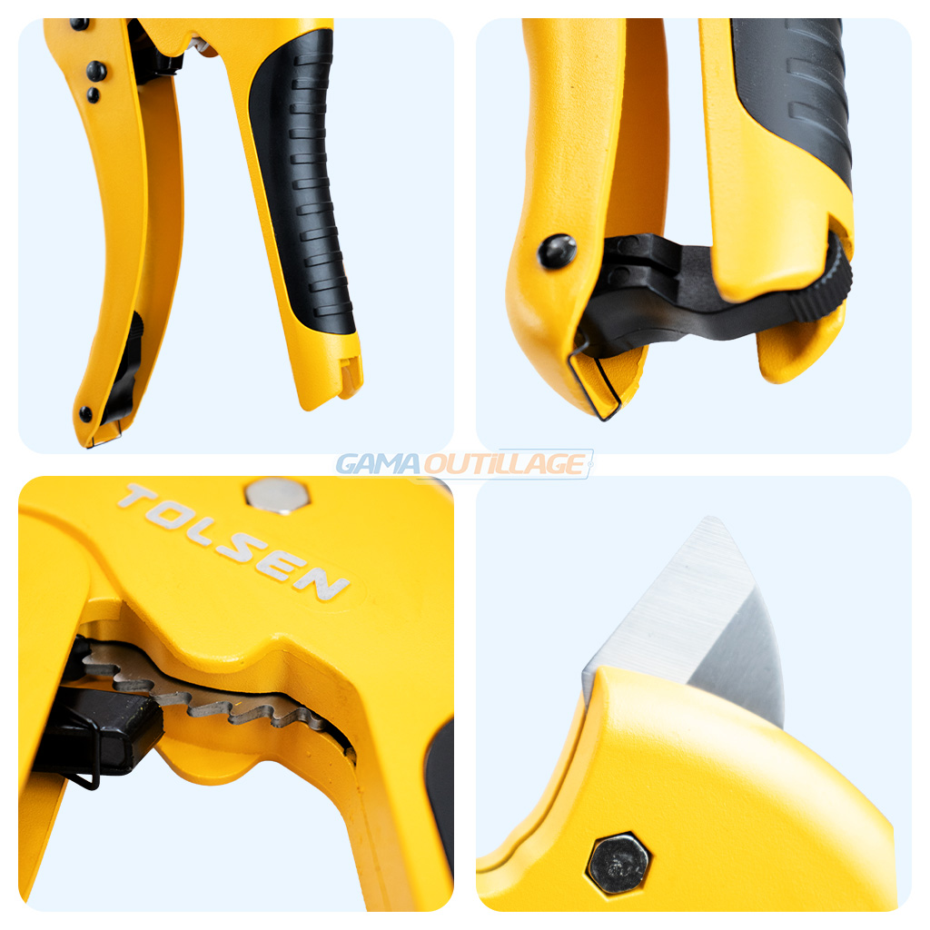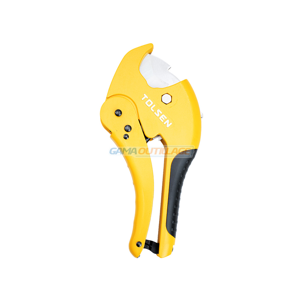Coupe-tube PVC industriel Tolsen 33001 de 42mm, doté d’une lame en acier inoxydable 3Cr13 et d’une ouverture automatique pour des coupes précises et rapides.