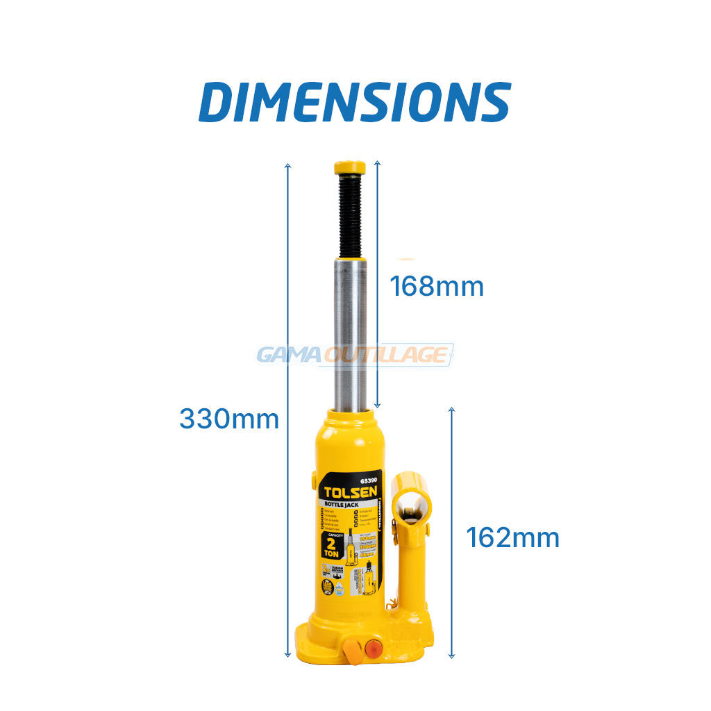 Le Cric bouteille hydraulique Tolsen référence 65390 est un équipement de levage de gamme industrielle conçu pour offrir une performance fiable et sécurisée. Avec une capacité de charge de 2 tonnes, ce vérin hydraulique est idéal pour les interventions mécaniques sur véhicules légers et petites machines. Sa structure robuste bénéficie d’une construction entièrement soudée garantissant une étanchéité parfaite contre les fuites d’huile, tandis que sa base en plaque d’acier offre une stabilité accrue par rapport aux modèles en fonte classiques.