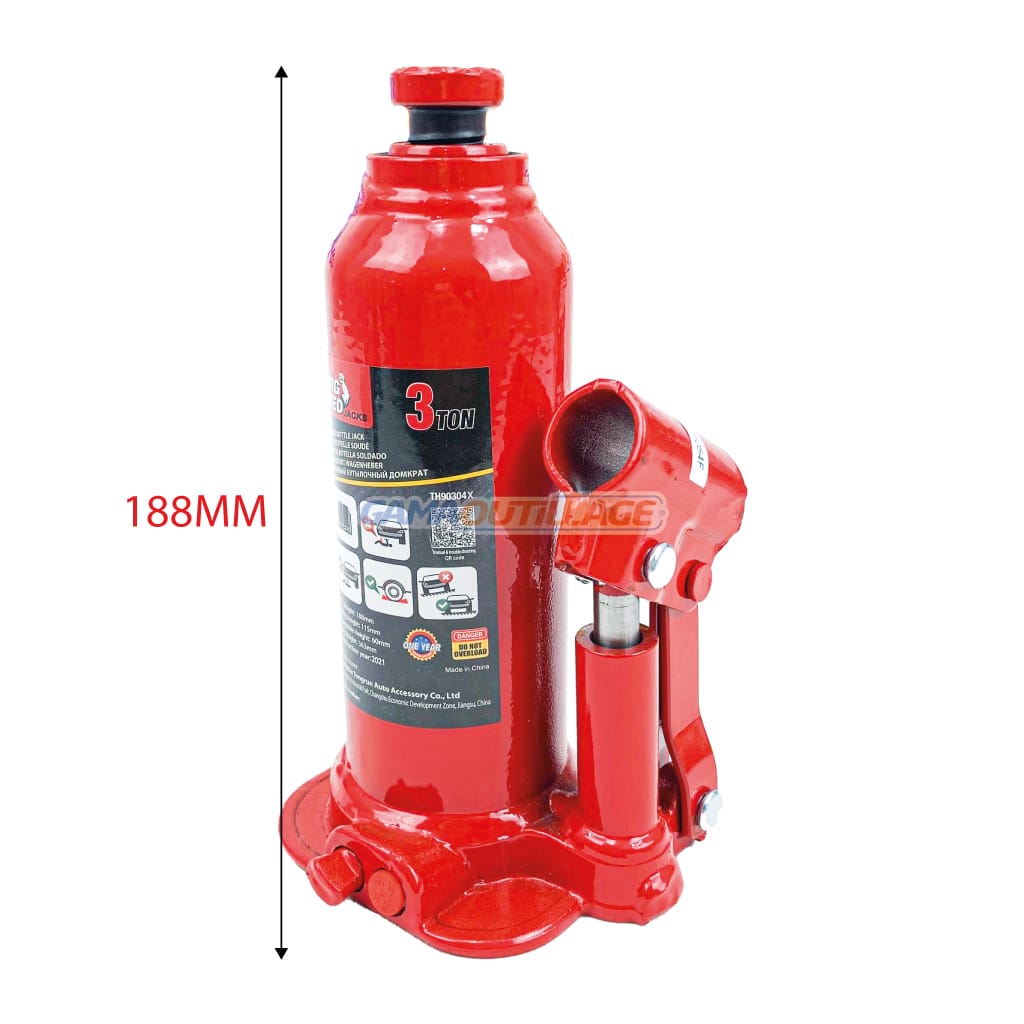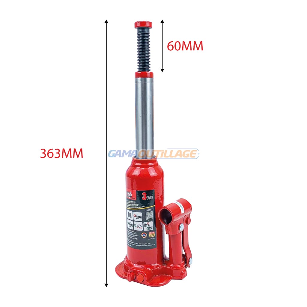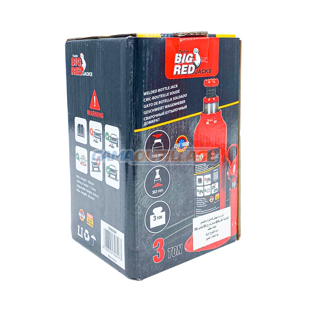 GAMAOUTILLAGE vous propose un CRIC BOUTEILLE 3TON BIG RED, Cric bouteille hydraulique conçu pour un usage résidentiel et commercial, la selle dentelée et traitée thermiquement offre une surface de levage généreuse et une prise en main,  Dispose d’une plage de levage de 18.8 cm à 36.3 cm avec une capacité de 2 tonnes, l’extension à vis réglable ajoute de la polyvalence, Conçu en utilisant une construction en acier allié forgé pour plus de qualité et de durabilité, la structure soudée intérieure/extérieure offre une performance sans fuite,