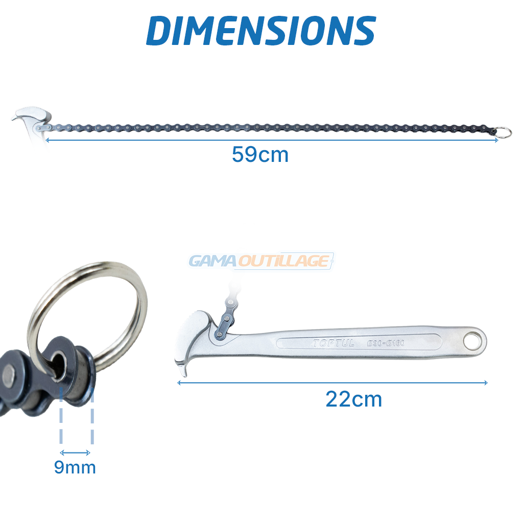 et le serrage des filtres à huile et pièces cylindriques. Grâce à sa chaîne métallique robuste et ajustable,