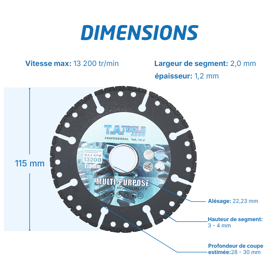 Le Disque Universel 115mm TA Tools référence 7800 est un accessoire de coupe haute performance utilisant la technologie de brasage sous vide (Vacuum Brazed Technology). Conçu pour offrir une polyvalence maximale sur le chantier, ce disque permet de traiter une grande variété de matériaux tels que le métal, la porcelaine, le plastique et le bois. Sa conception robuste avec des segments de haute qualité garantit une coupe nette et rapide tout en assurant une longévité accrue, même lors d’utilisations intensives sur des matériaux hétérogènes.