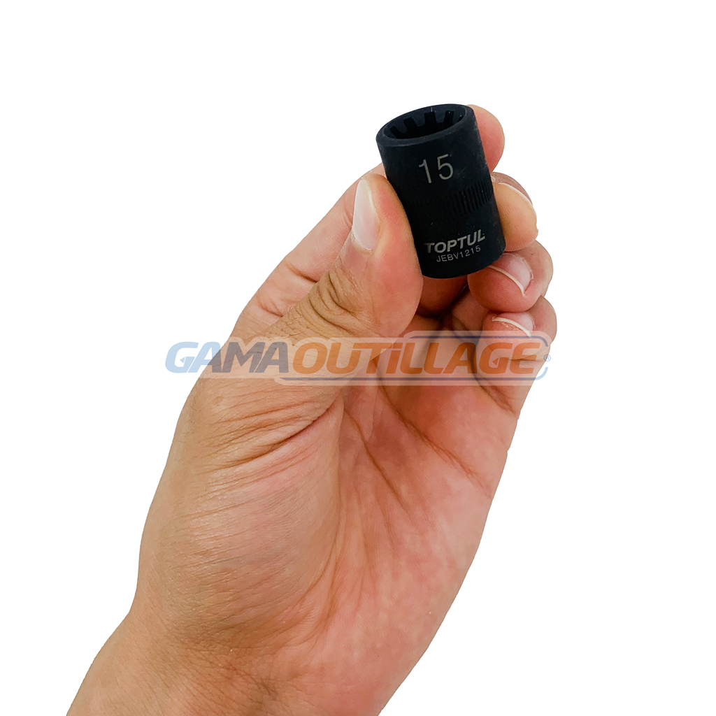 DOUILLE 3/8 N°15 10PANS POUR ETRIER DE FREIN TOPTUL, est un outil spécialisé utilisé dans la mécanique automobile, plus particulièrement pour travailler sur les étriers de frein.