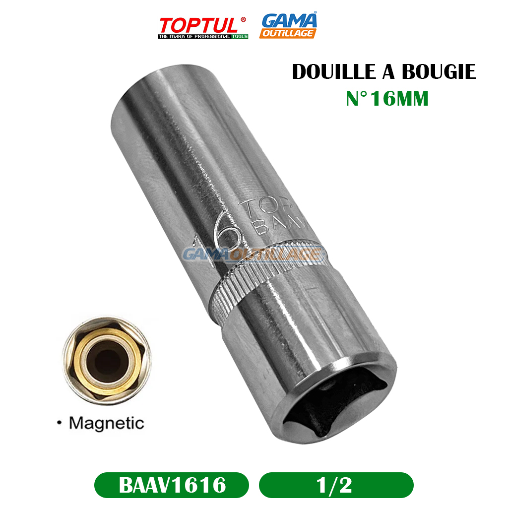 DOUILLE A BOUGIE N° 16 1/2 TOPTUL, un outil spécialement conçu pour serrer ou desserrer les bougies d’allumage d’un moteur à combustion interne.