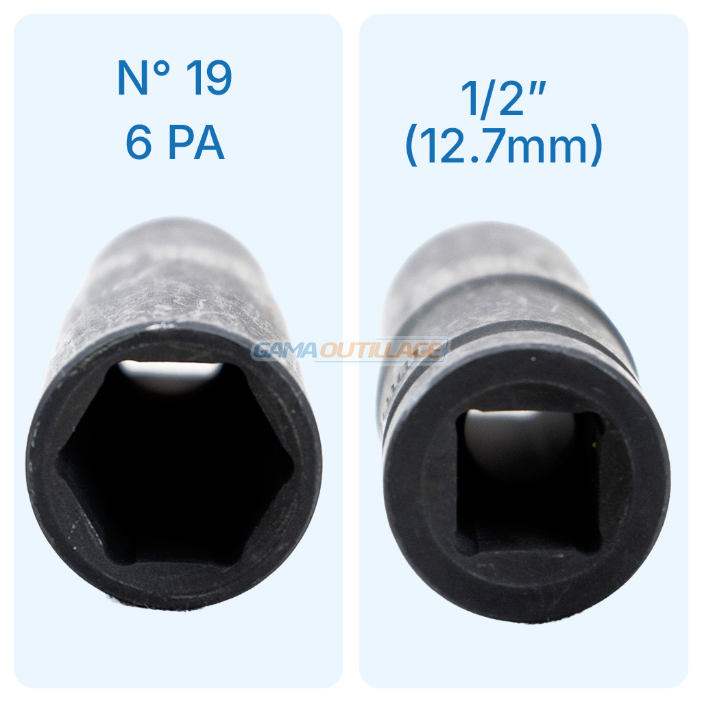 Douille à choc longue de 19mm, entraînement 1/2 pouce, profil 6 pans. Fabriquée en acier CR-MO avec finition phosphatée pour une durabilité maximale sous fortes contraintes.