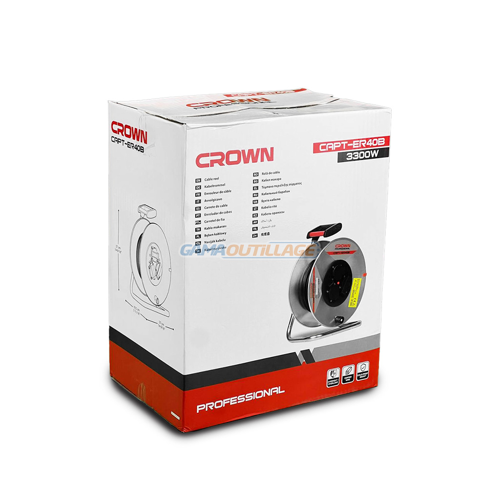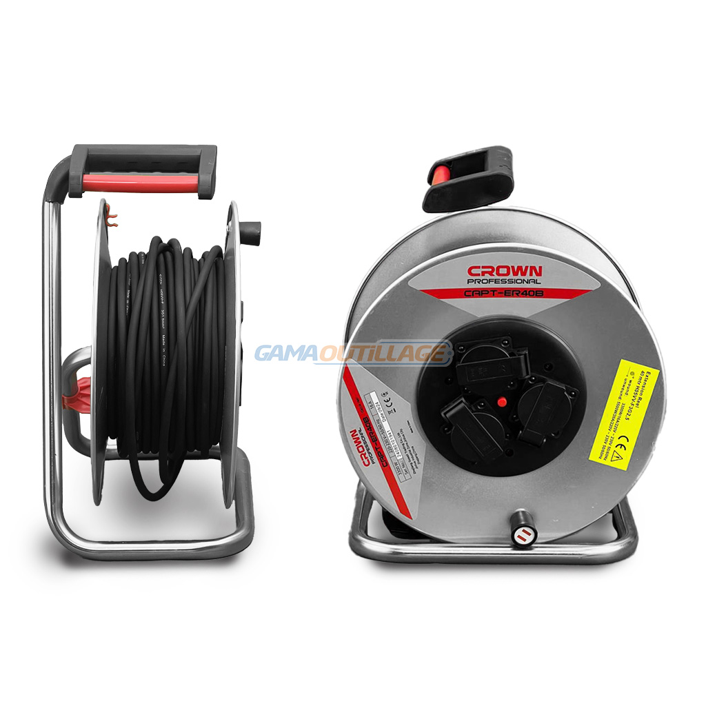 L’ENROULEUR CABLE ELECTRIQUE CROWN (référence CAPT-ER40B) est un enrouleur professionnel doté d’un câble de 40 mètres de long avec une section de 3*2.5mm. Il est équipé de quatre prises de courant. La puissance maximale déroulée est de 3300W. Son diamètre est de 37 cm et sa hauteur est de 20 cm.