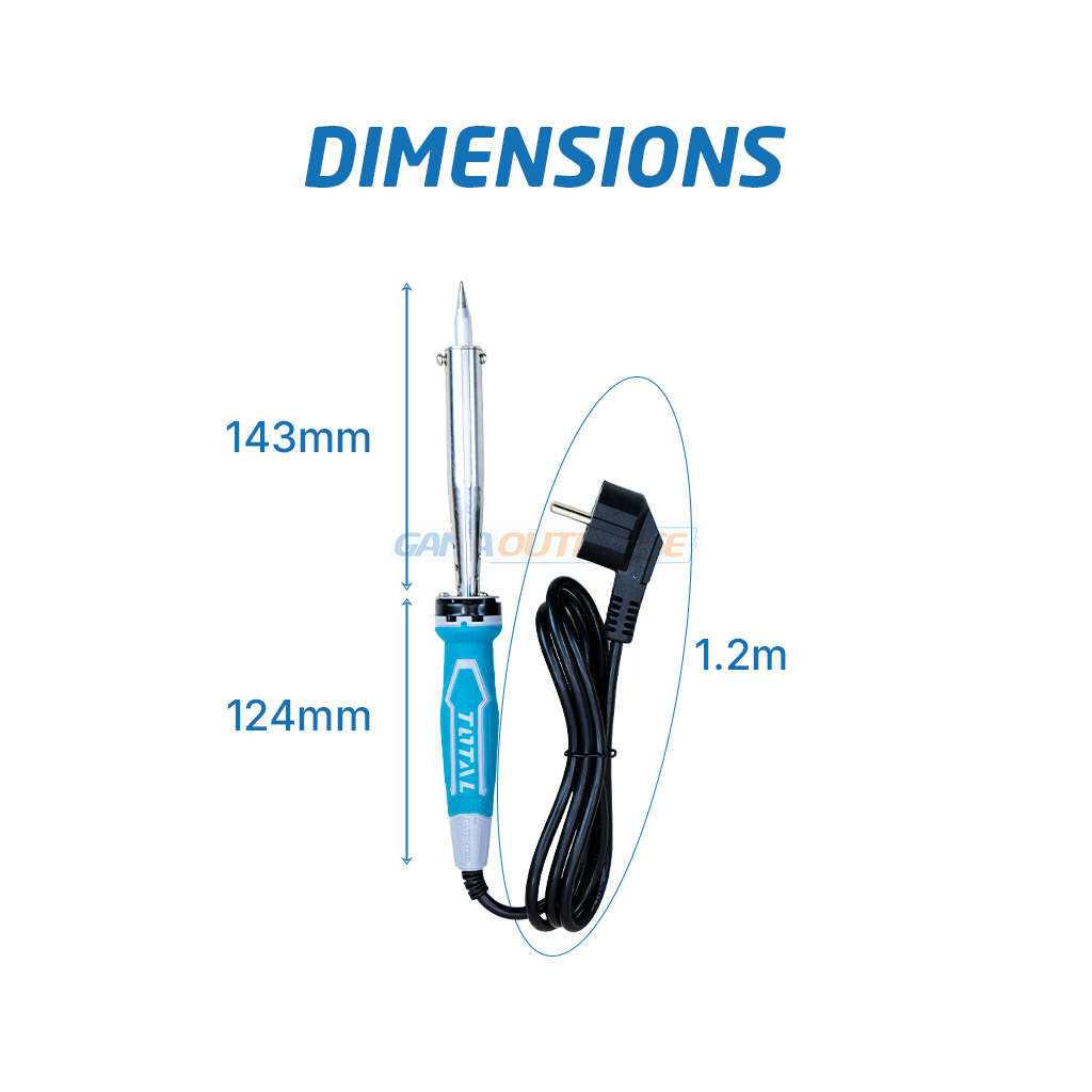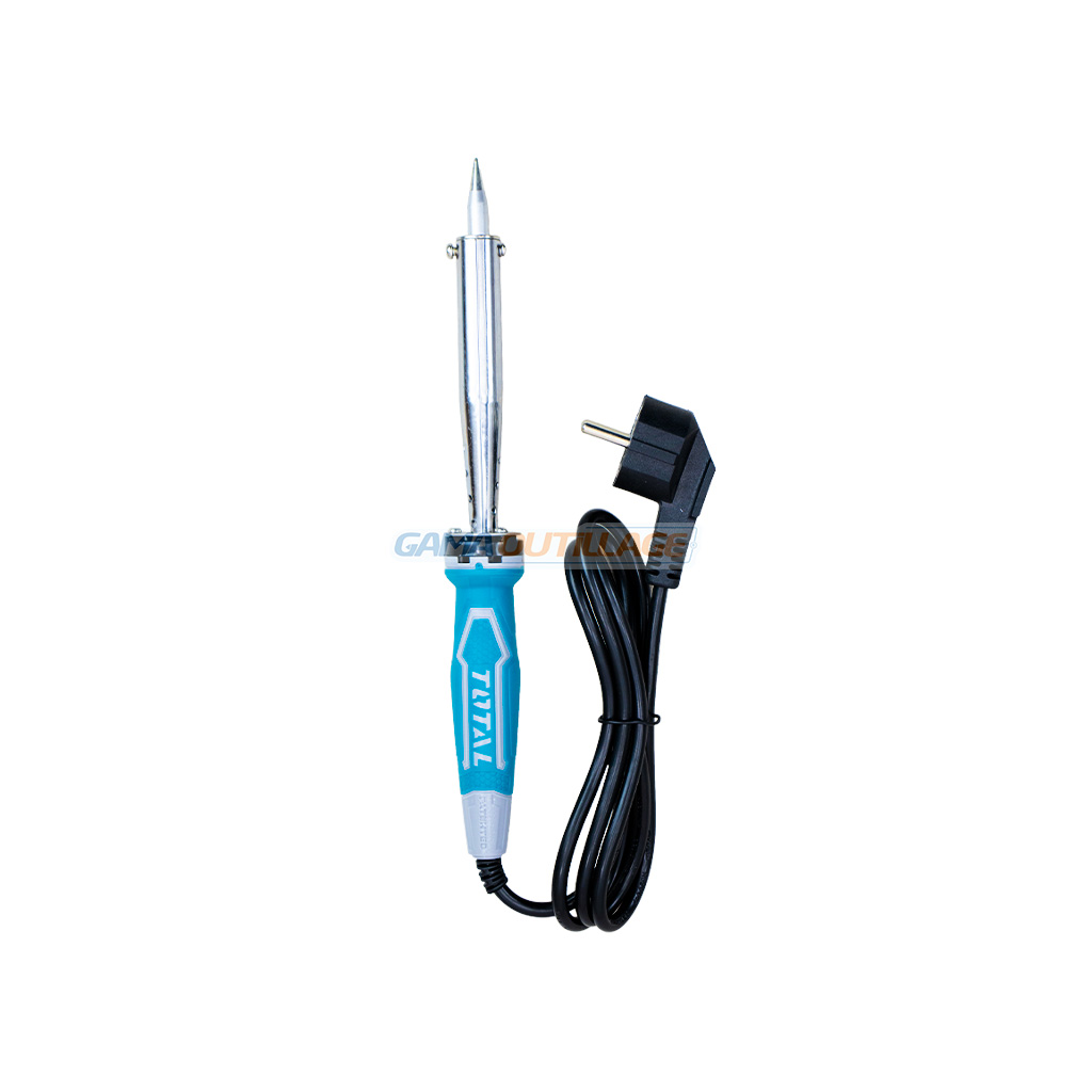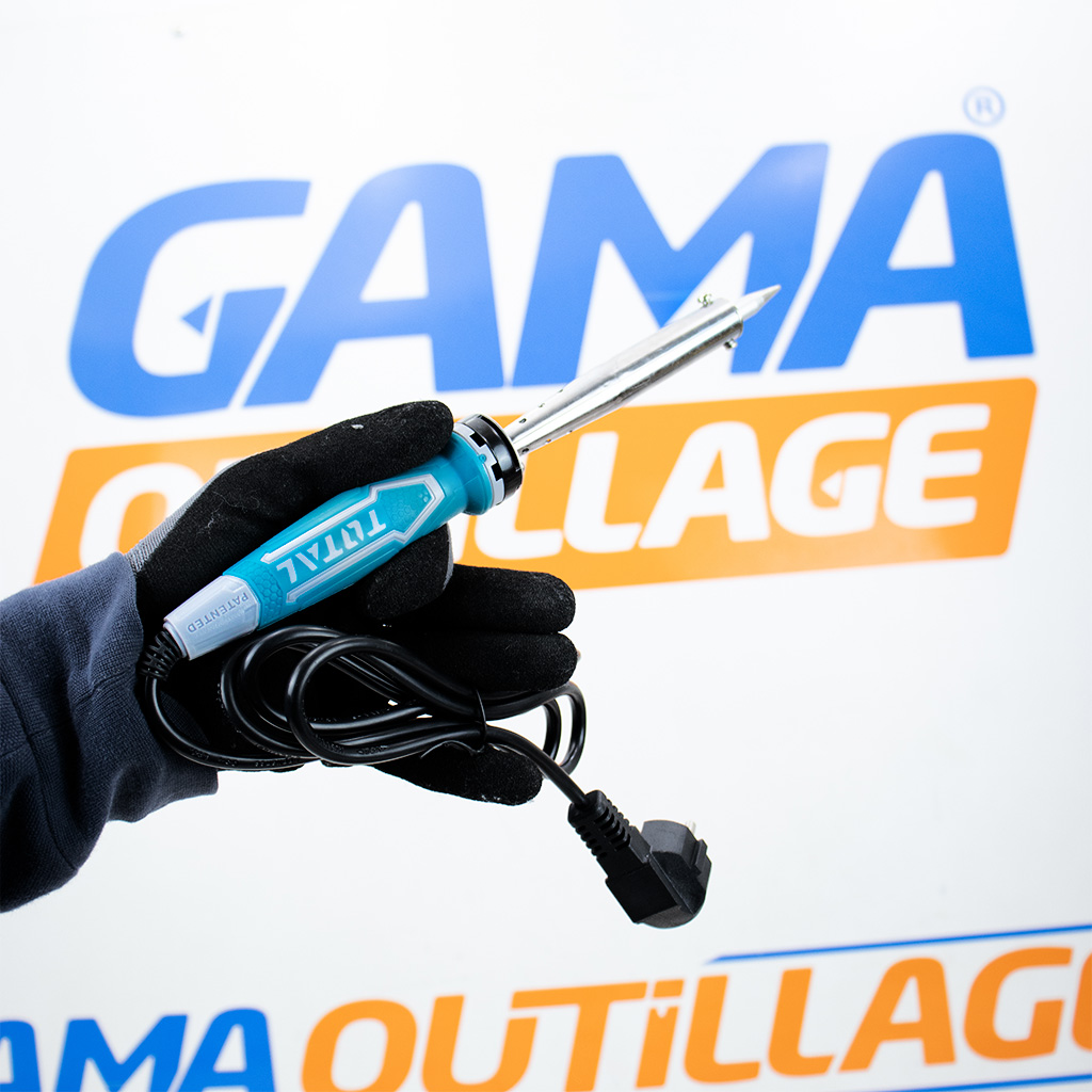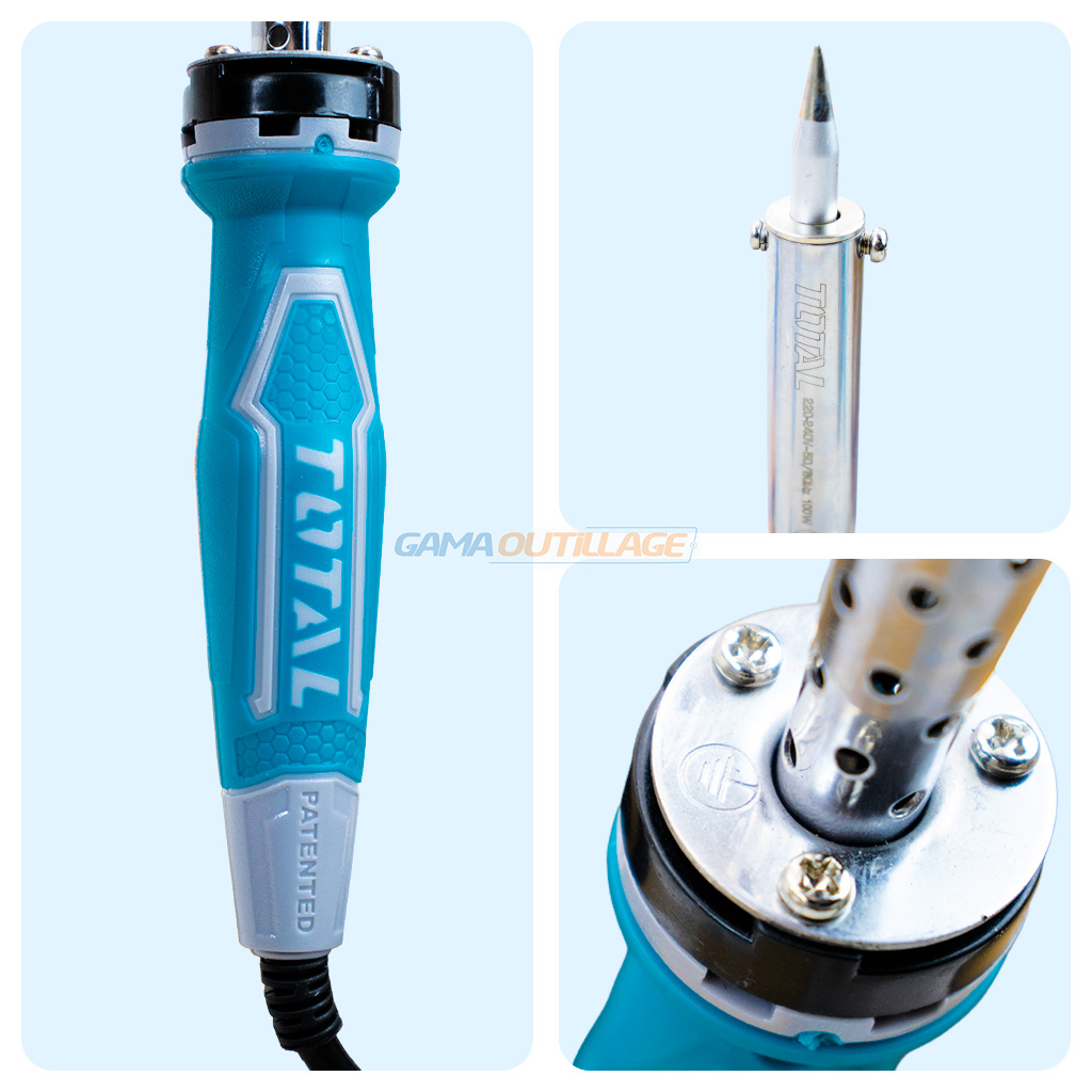 Fer à souder industriel 100W Total (TET10006) avec manche ergonomique soft grip, temps de chauffe rapide de 3-5 min et panne droite haute précision.