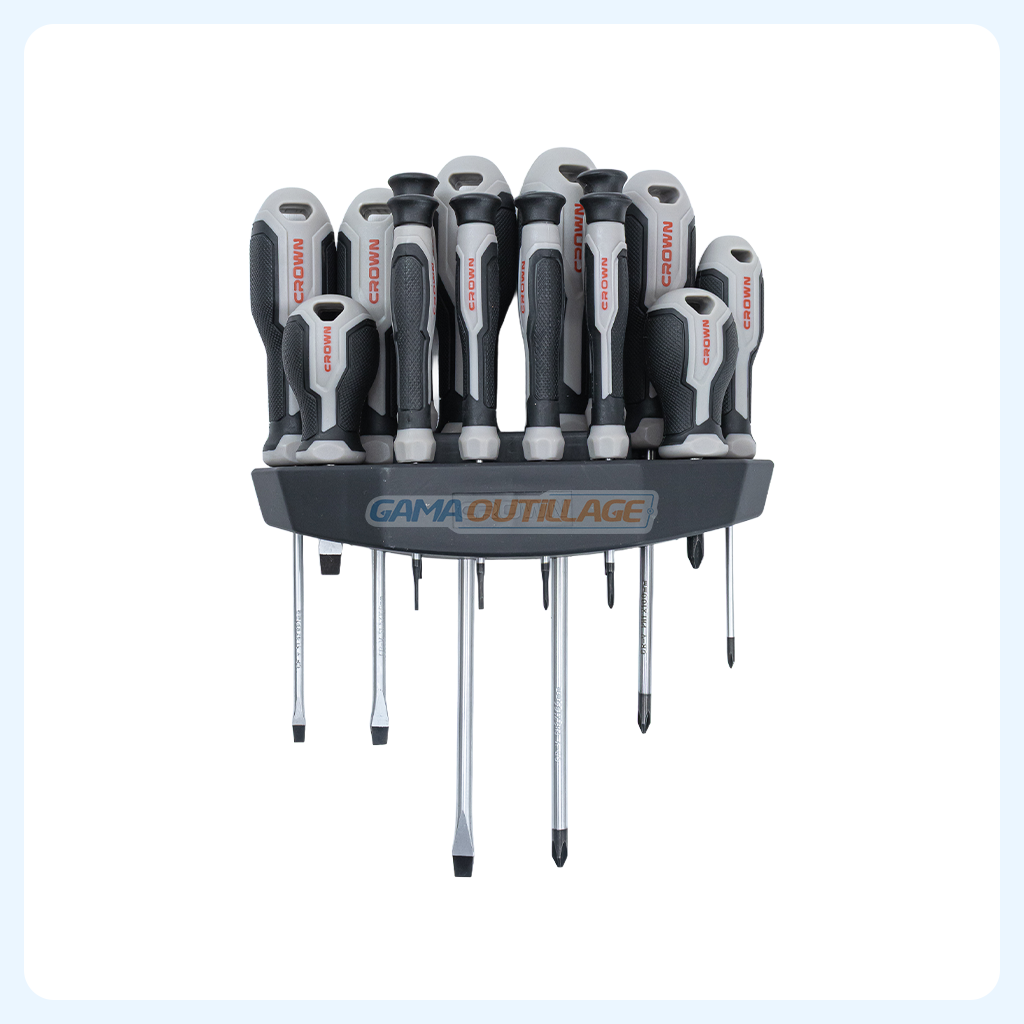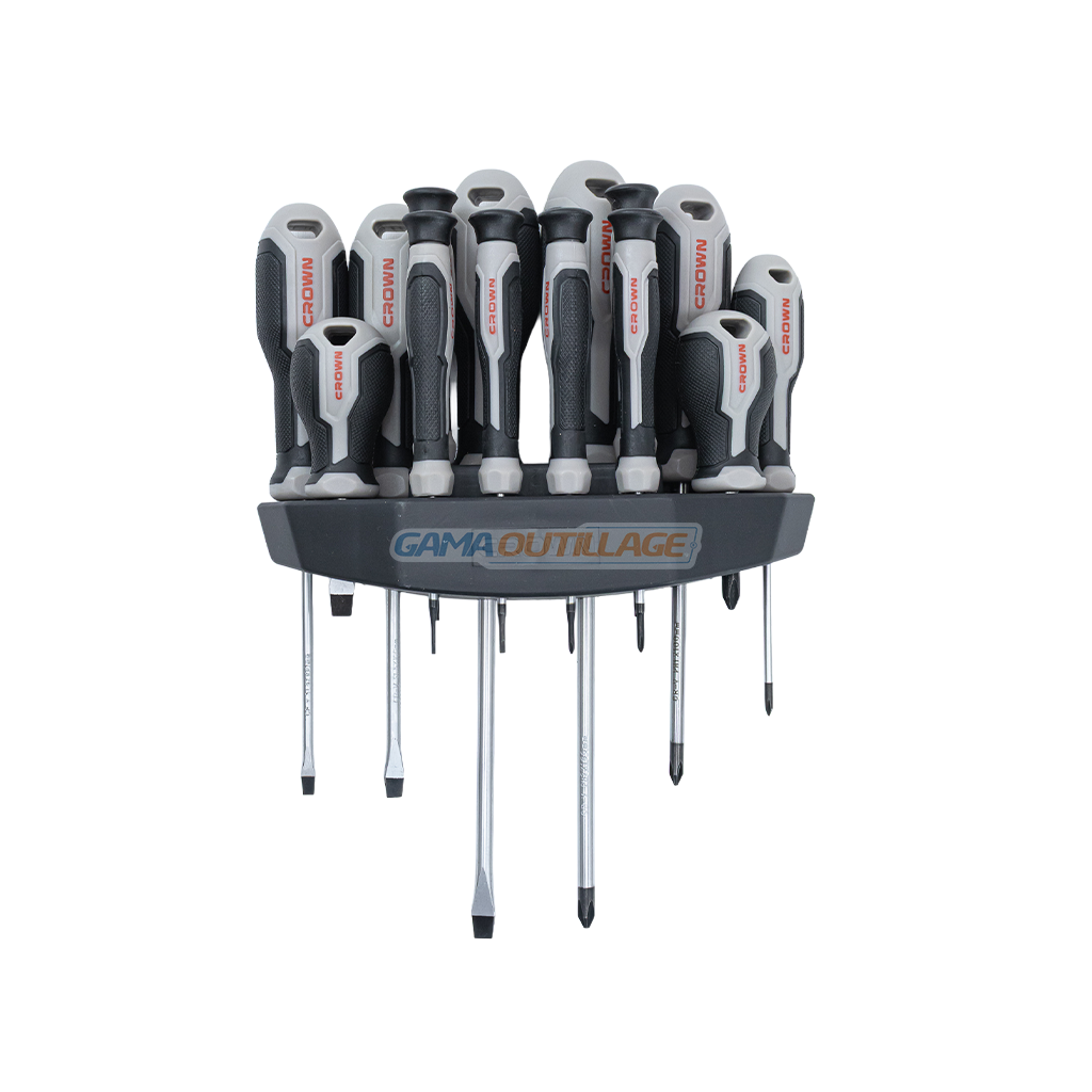 Ce jeu de tournevis CROWN se compose de 14 pièces en acier CR-V avec pointes magnétiques, offrant une excellente précision et une prise en main confortable. Chaque tournevis possède une poignée bi-matière ergonomique, garantissant un contrôle optimal et un usage prolongé sans fatigue.