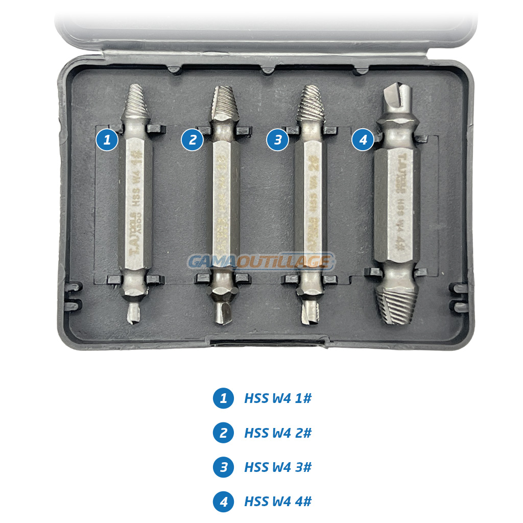 Jeu extracteur de vis 4 pièces TA07545 en acier HSS. Idéal pour retirer vis cassées, usées ou bloquées. Livré en coffret compact. Chez GAMA OUTILLAGE.