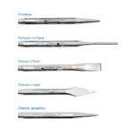 - Le jeu comprend un poinçon à pointe carrée, un poinçon à pointe ronde, un poinçon à pointe pointue, un poinçon à pointe plate et un poinçon à pointe d’angle.