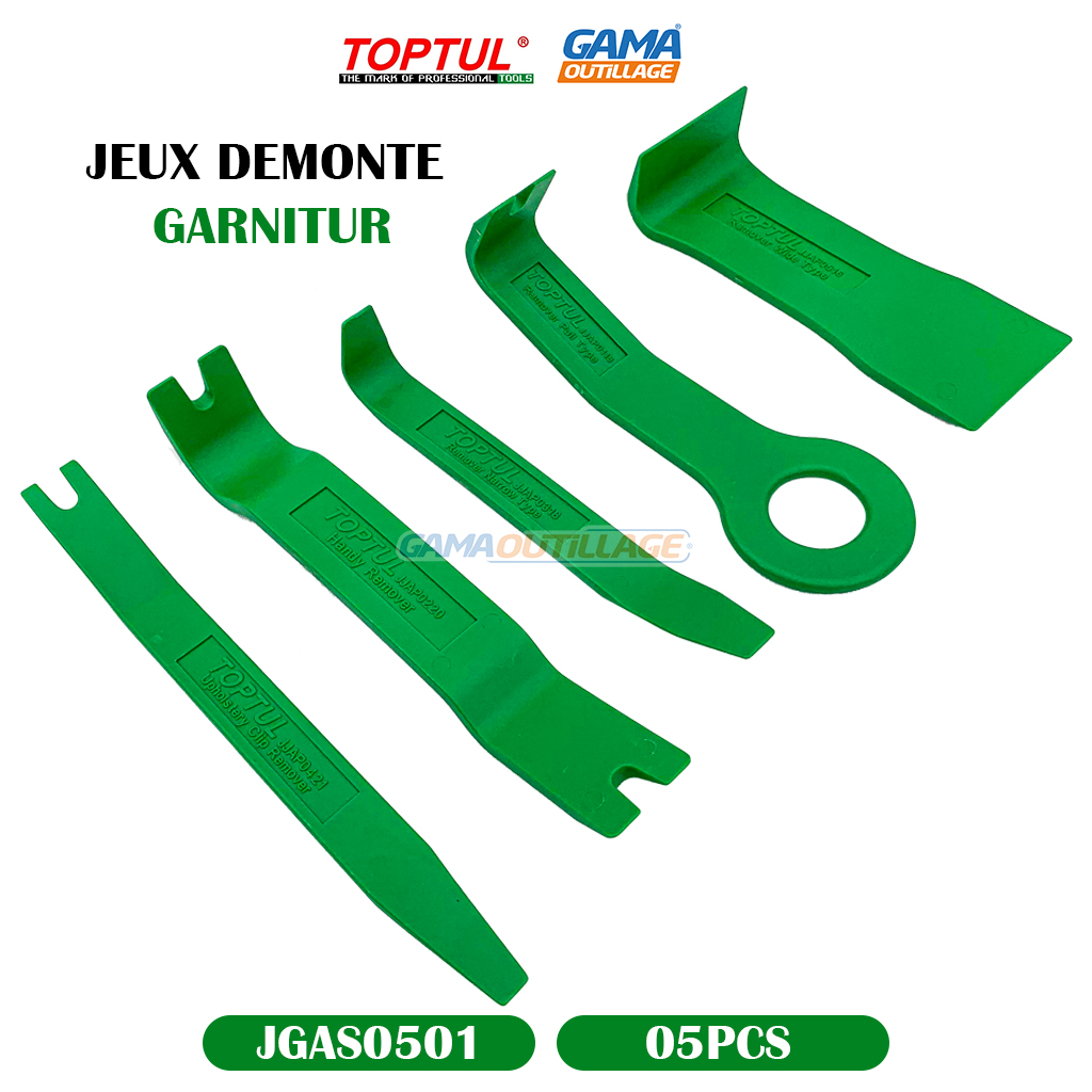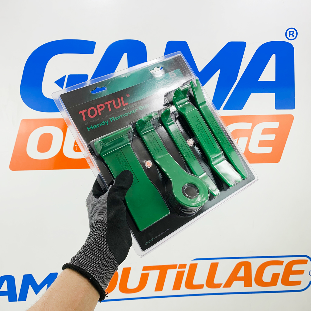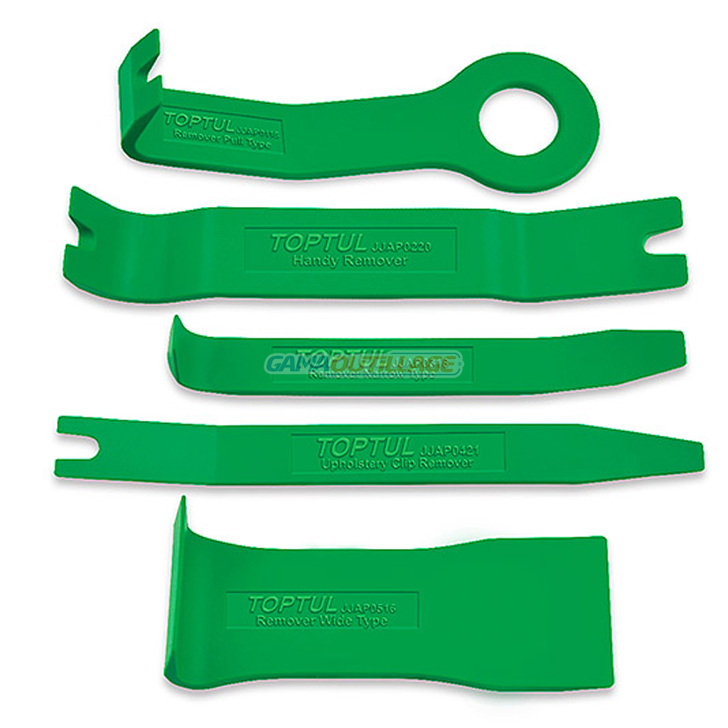 GAMAOUTILLAGE vous propose une JEUX DEMONTE GARNITUR 05 PCS TOPTUL, est un ensemble de 5 outils en nylon pour le démontage des garnitures automobiles sans les abîmer, parfait pour retirer les panneaux de porte, les garnitures de tableau de bord, les consoles centrales, etc, conception robuste et durable pour une utilisation professionnelle, ergonomie optimisée pour une prise en main confortable et une utilisation précise.