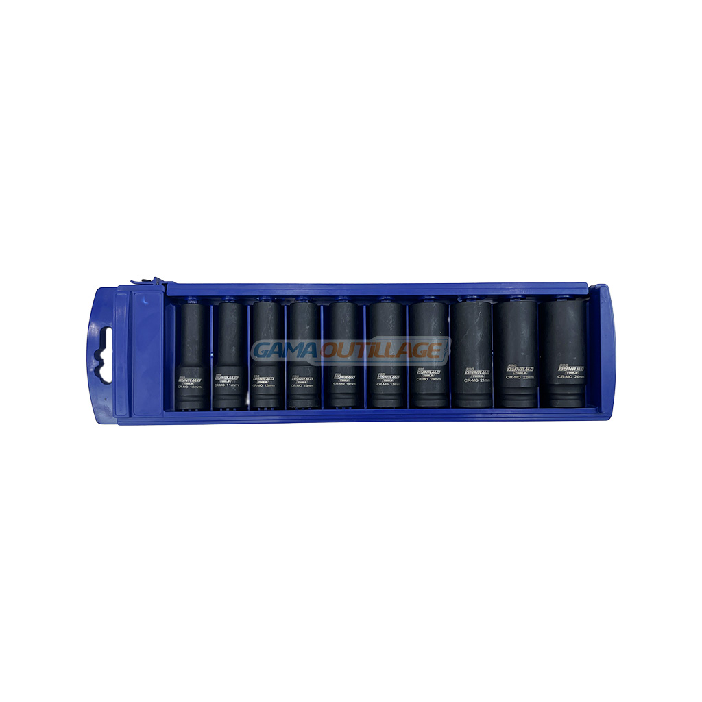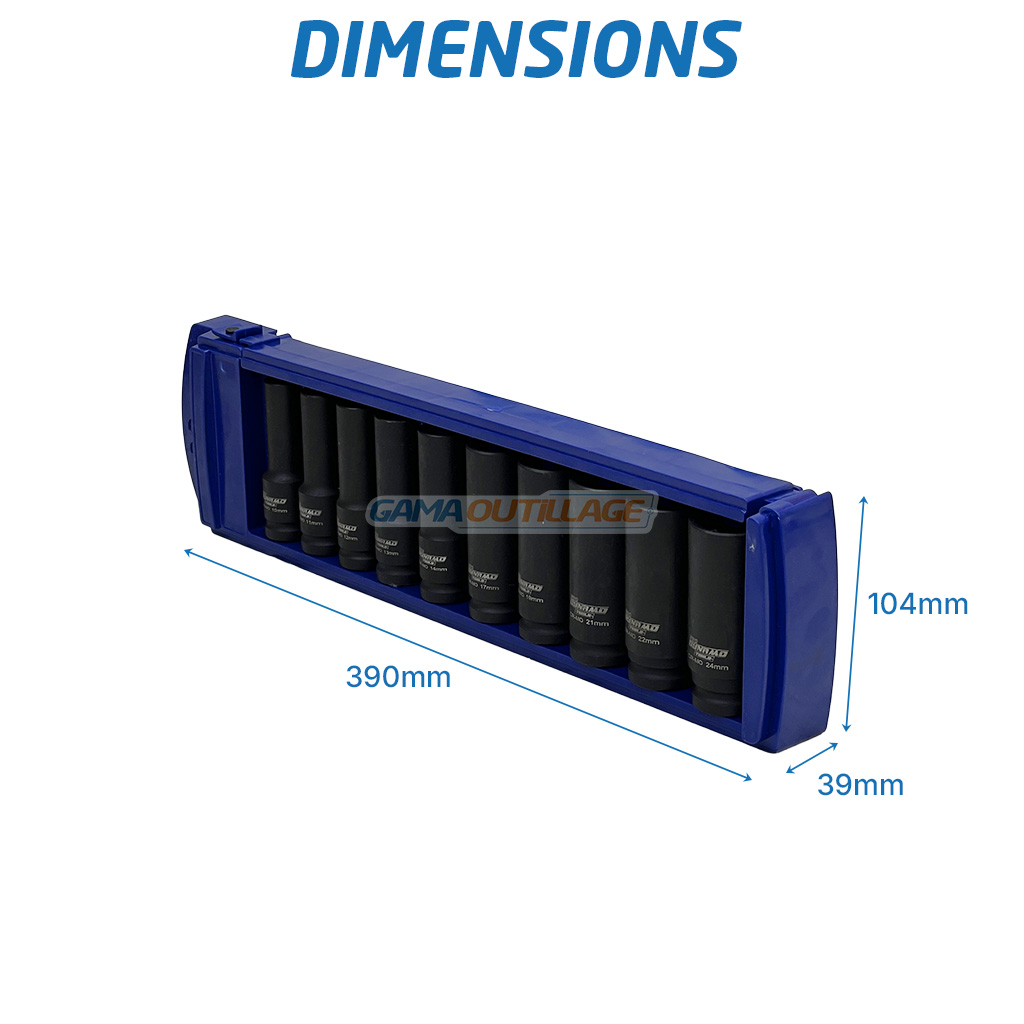 Ce coffret comprend 10 douilles longues de 10 à 24 mm, rangées dans un support rigide compact et pratique. Idéal pour les mécaniciens professionnels, ateliers et garages.