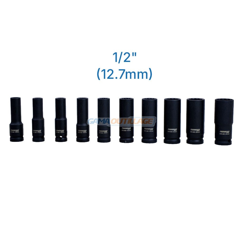 Jeu de 10 douilles à choc longues DYNAMO à profil 12 pans avec carré 1/2″. Tailles de 10 à 24 mm, livré dans coffret de rangement.