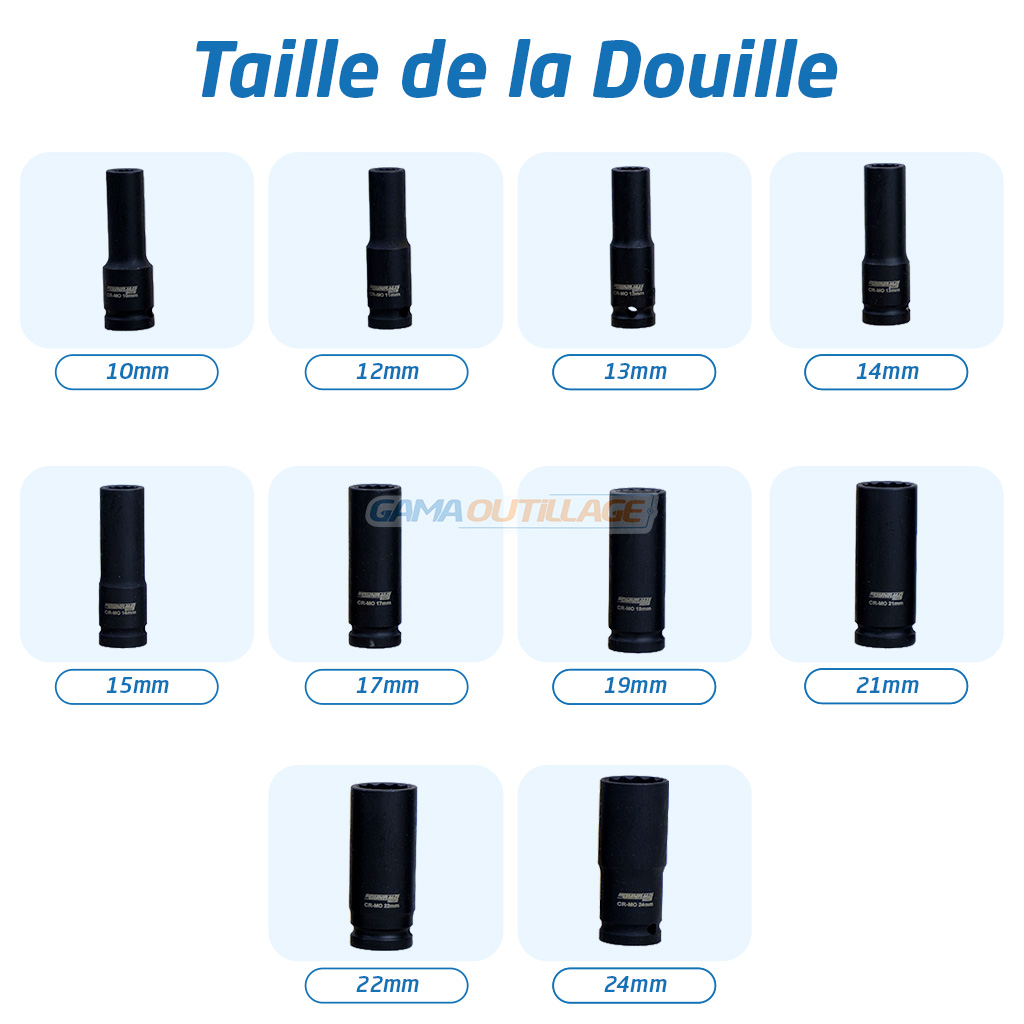 | Tailles des douilles | 10 mm 12 mm 13 mm 14 mm 15 mm 17 mm 19 mm 21 mm 22 mm 24 mm |