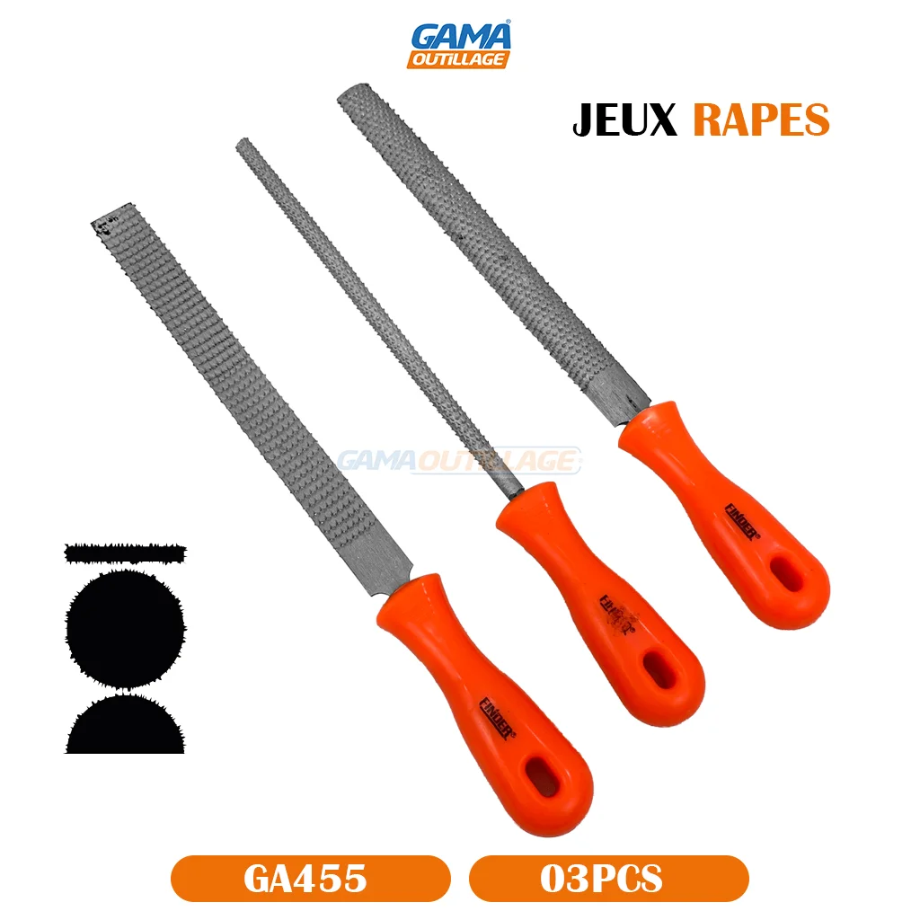 GAMAOUTILLAGE vous propose une JEUX RAPES 03PCS FINDER, cette ensemble de 3 pièces comprend une lime semi-circulaire à dents grossières, une lime plate à dents grossières, une lime ronde à dents grossières.