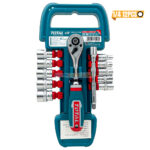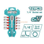 KIT CLIQUET ET DOUILLE 1/4 12PCS TOTAL, est un ensemble d’outils comprenant un cliquet et des douilles de différentes tailles, couramment utilisé pour le serrage et le desserrage d’écrous et de boulons.