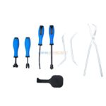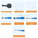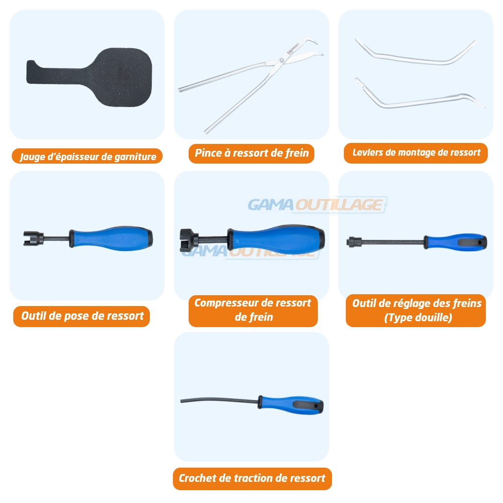 | Composition du kit | – Jauge d’épaisseur de garniture – Pince à ressort de frein – Leviers de montage de ressort – Outil de pose de ressort – Compresseur de ressort de frein – Outil de réglage des freins (Type douille) – Crochet de traction de ressort |