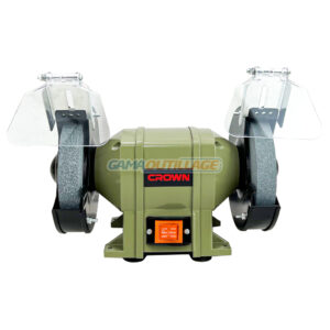 TOURET A MEULER 150 MM 250 W CROWN, est un outil polyvalent qui peut être utilisé pour affûter des outils, façonner des pièces métalliques ou retirer de la matière. Il est équipé de deux meules abrasives, une à gros grain et une à grain fin, ce qui lui permet de répondre à une grande variété de besoins.
