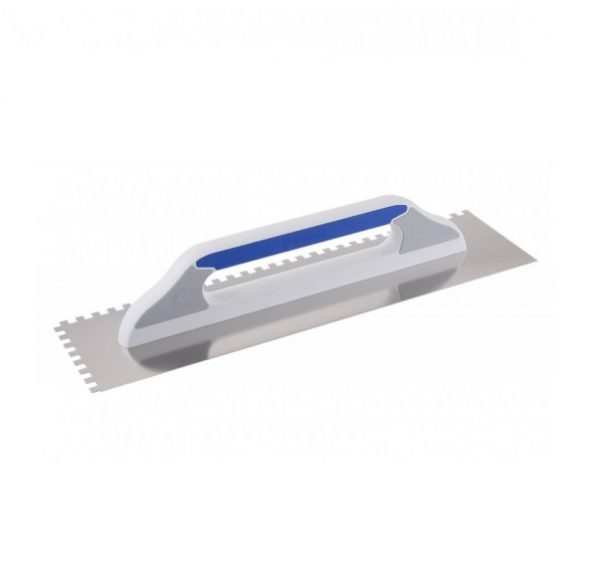 - Acier inoxydable, résistant aux acides, manche en plastique, denté 8х8 mm, pour le revêtement de sol d’un parquet et l’imposition de solutions, de colles et de couches de revêtement de plâtre.