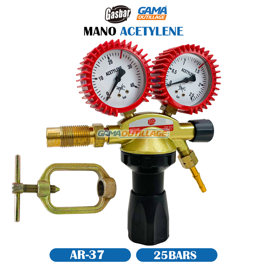 GAMAOUTILLAGE vous propose une MANO ACETYLENE AR-37 GASBAR, est un appareil utilisé pour réguler la pression du gaz acétylène provenant d’une bouteille de stockage. Il est essentiel pour la sécurité et l’efficacité des applications de soudage et de découpage oxyacétyléniques.