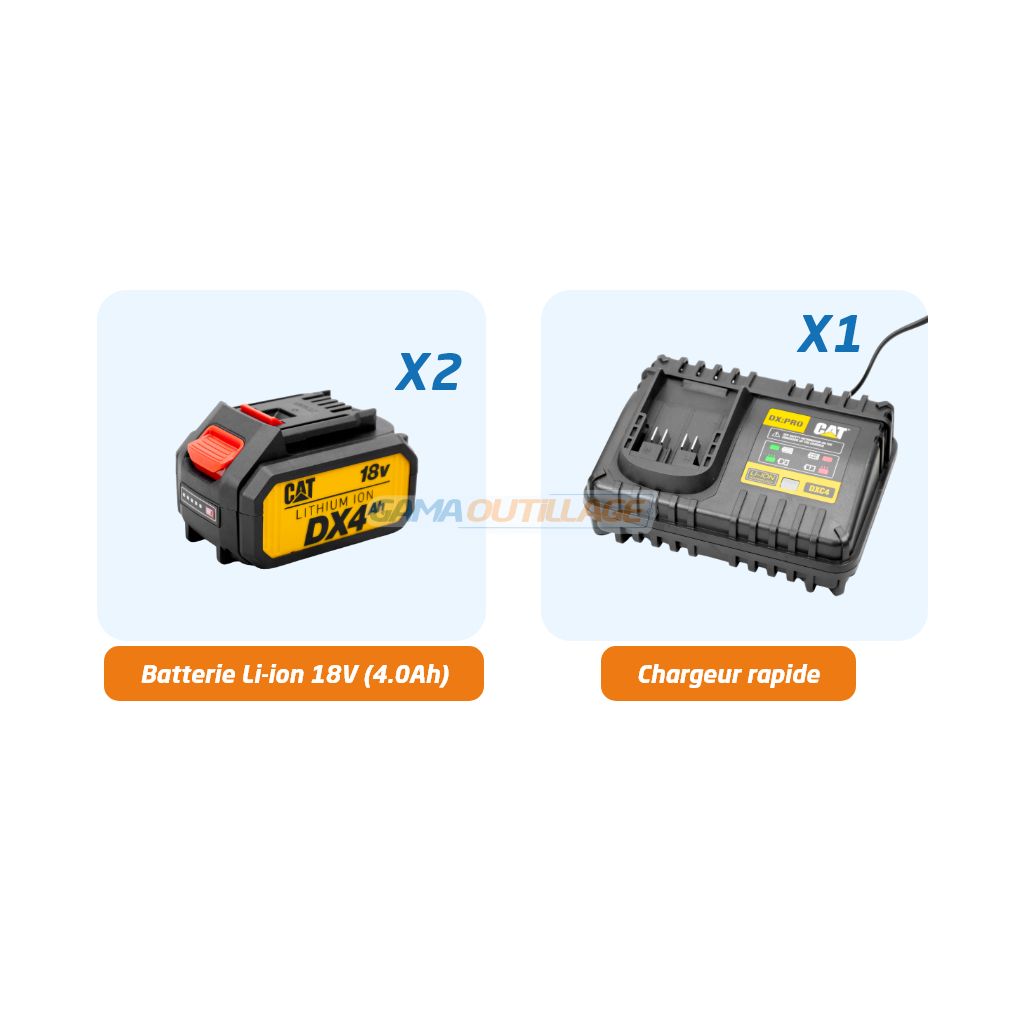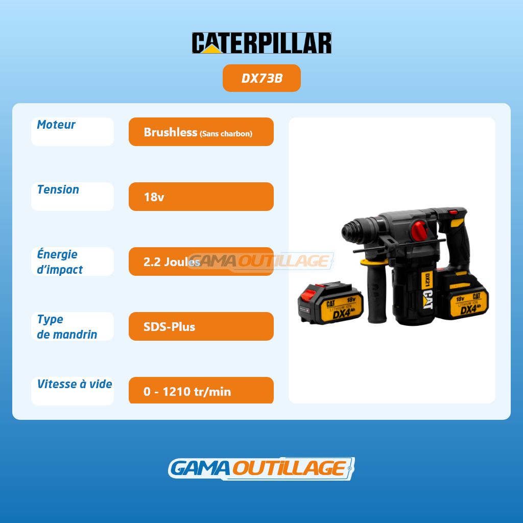 Marteau perforateur sans fil Caterpillar DX21 avec moteur brushless 18V, force de frappe de 2.2J et mandrin SDS-Plus. Livré avec 2 batteries 4.0Ah et chargeur rapide.