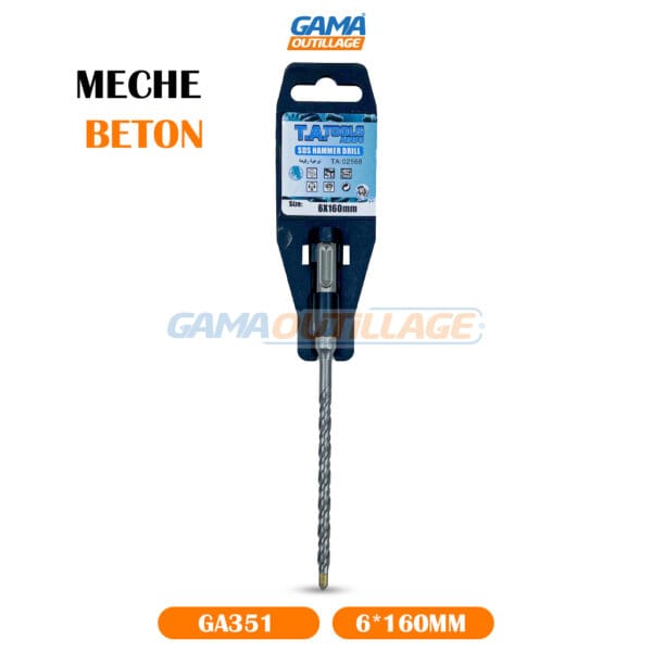 GAMAOUTILLAGE vous propose une MECHE BETON 6*160 SDS PLUS TA, est un outil utilisé pour percer des trous dans le béton, la pierre et les matériaux similaires. Elle a un diamètre de 06 mm et une longueur totale de 160mm.