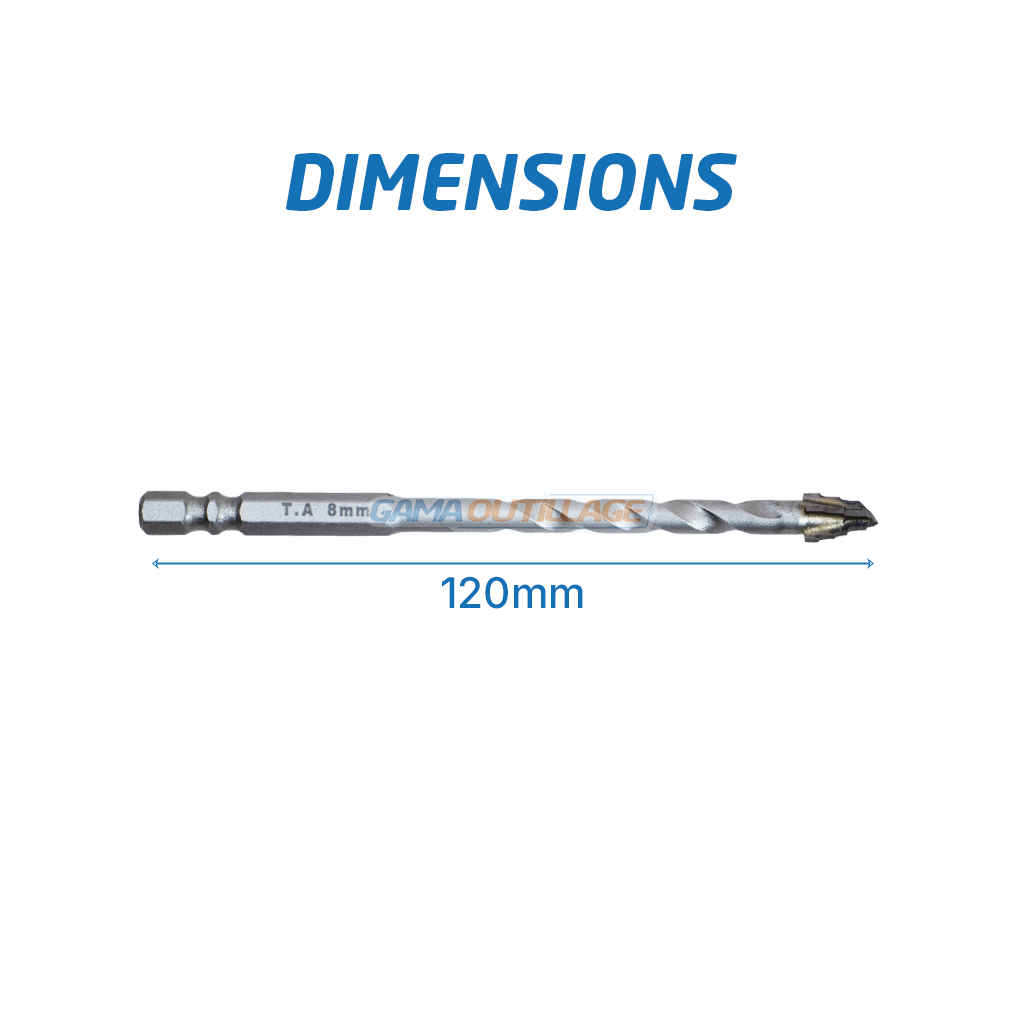 Mèche céramique 8mm 4 têtes étagées TA, longueur 120mm, idéale pour carrelage et faïence avec perçage précis sans éclats.