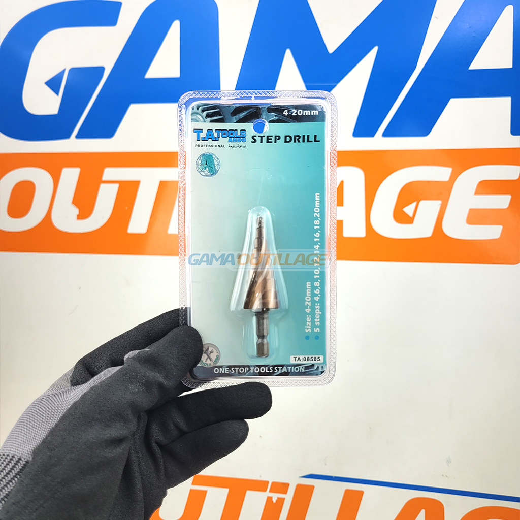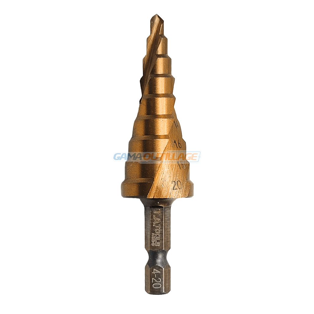 La mèche étagée TA 08585 est conçue pour un perçage progressif sans changement d’outil. Elle permet de réaliser des trous nets de 4 à 20 mm grâce à ses marches gravées directement sur le foret. Son embout hexagonal assure une bonne prise et une fixation sécurisée dans un porte-embout ou un mandrin de perceuse.