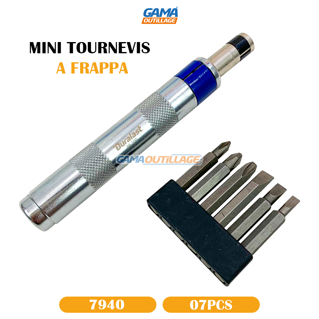 GAMAOUTILLAGE vous propose MINI TOURNEVIS A FRAPPA 7PCS TA, Cet ensemble d’outils est idéal pour retirer les vis et boulons gelés, rouillés ou cassés. Il est compact et conçu pour les espaces restreints, offrant un contrôle précis pour les petites vis.