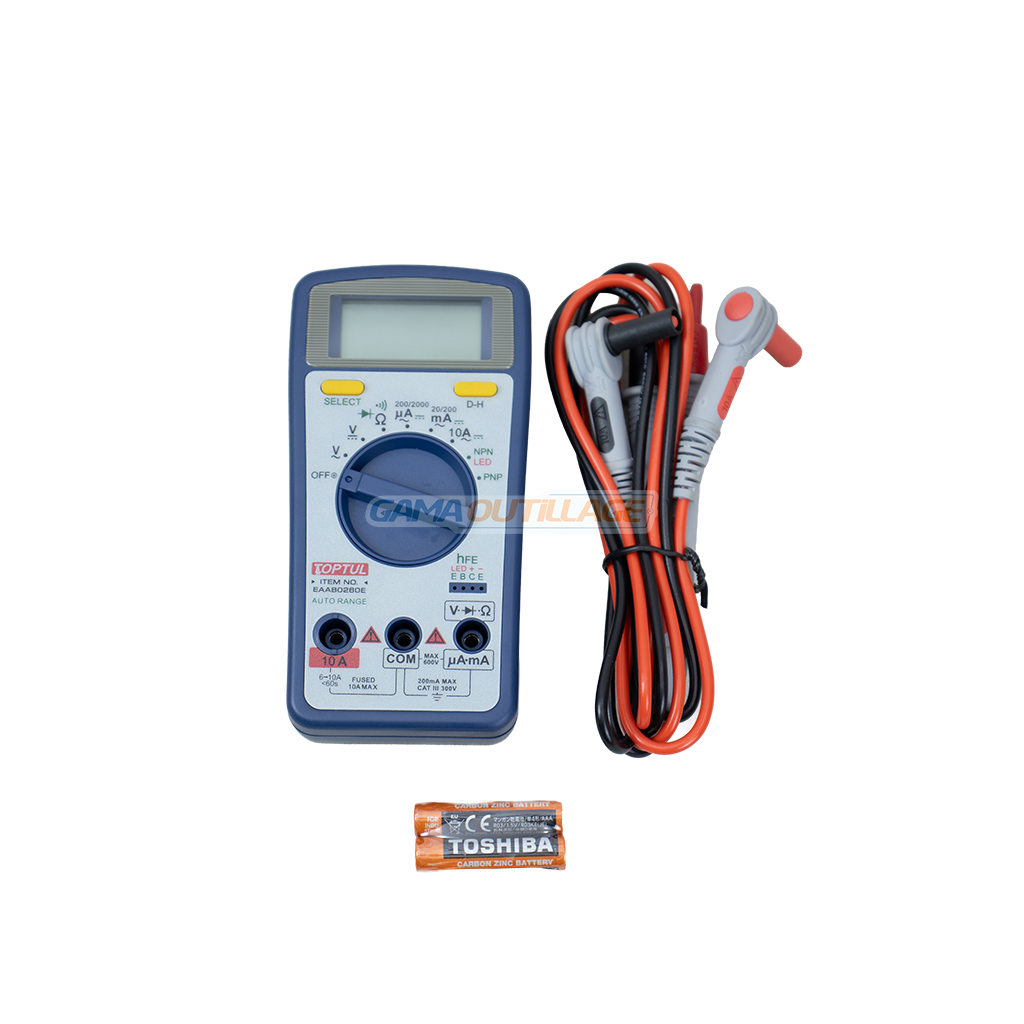 Multimètre digital TOPTUL EAAB0260E avec Auto Range, test de continuité, diodes, LED et transistors. Idéal pour diagnostics électriques précis.