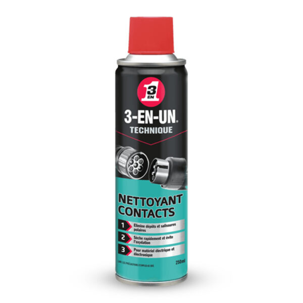 NETTOYANT CONTACTS 3EN1 250 ML WD 40, est un Formulé aux solvants, le Nettoyant Contacts 3-EN-UN® TECHNIQUE supprime les dépôts gras, salissures polaires et saletés diverses sur les équipements électriques et électroniques : contacteurs, interrupteurs, bornes, circuits imprimés, relais, capteurs, etc.